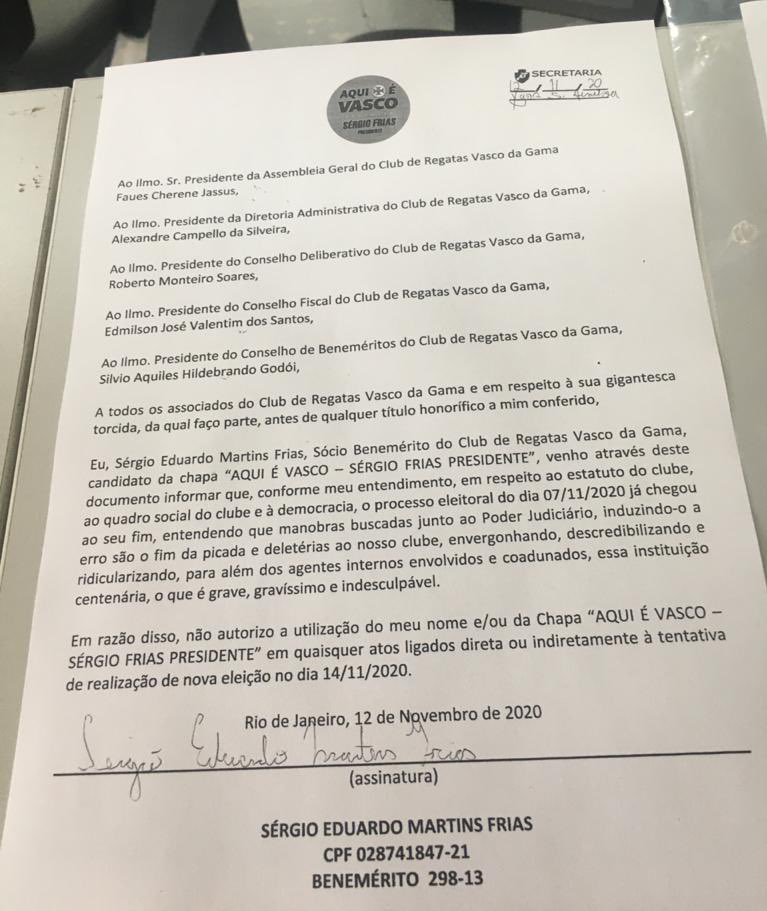 Eu, Sérgio Eduardo Martins Frias, Sócio Benemérito do Club de Regatas Vasco da Gama, candidato da chapa "AQUI É VASCO – SÉRGIO FRIAS PRESIDENTE", venho através deste documento informar que, conforme meu entendimento, em respeito ao estatuto do clube, ao quadro social do clube e à democracia, o processo eleitoral do dia 07/11/2020 já chegou ao seu fim, entendendo que manobras buscadas junto ao Poder Judiciário, induzindo-o a erro são o fim da picada e deletérias ao nosso clube, envergonhando, descredibilizando e ridicularizando, para além dos agentes internos envolvidos e coadunados, essa instituição centenária, o que é grave, gravíssimo e indesculpável.