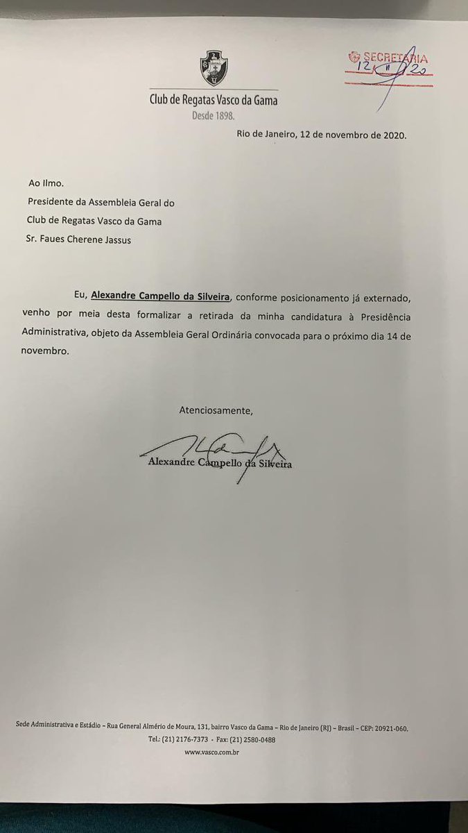 A carta-renúncia, oficializando sua saída da eleição online do Vasco deste sábado