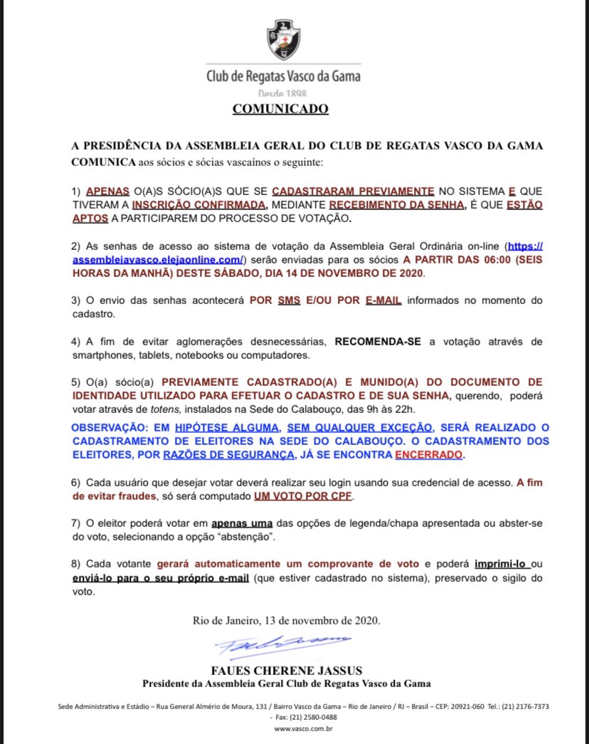 Clique abaixo e veja o comunicado oficial enviado pelo Presidente da Assembleia Geral do Club de Regatas Vasco da Gama, Faués Cherene Jassus.