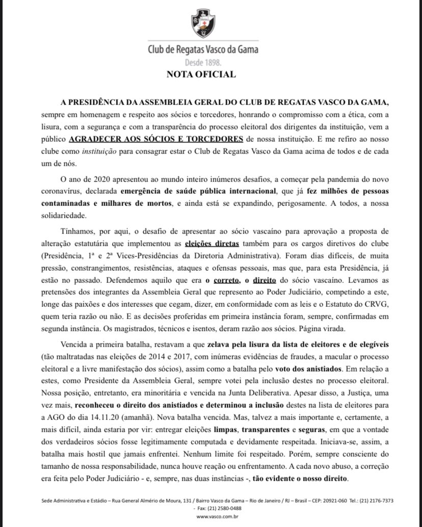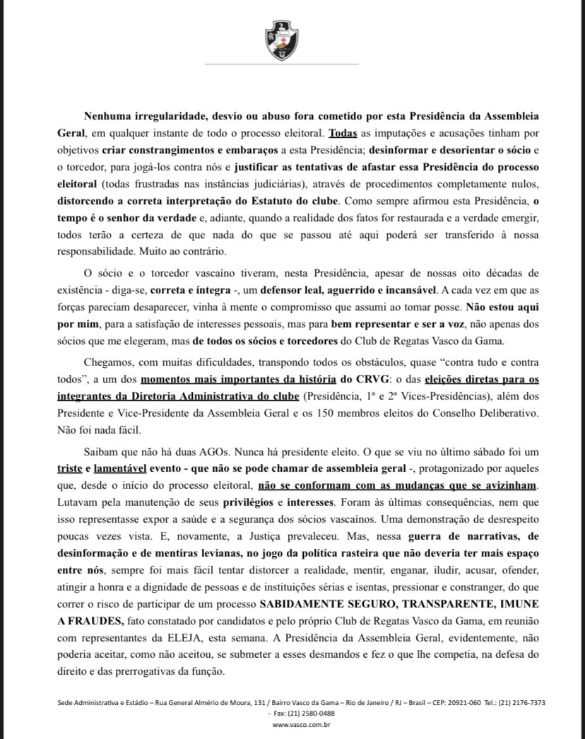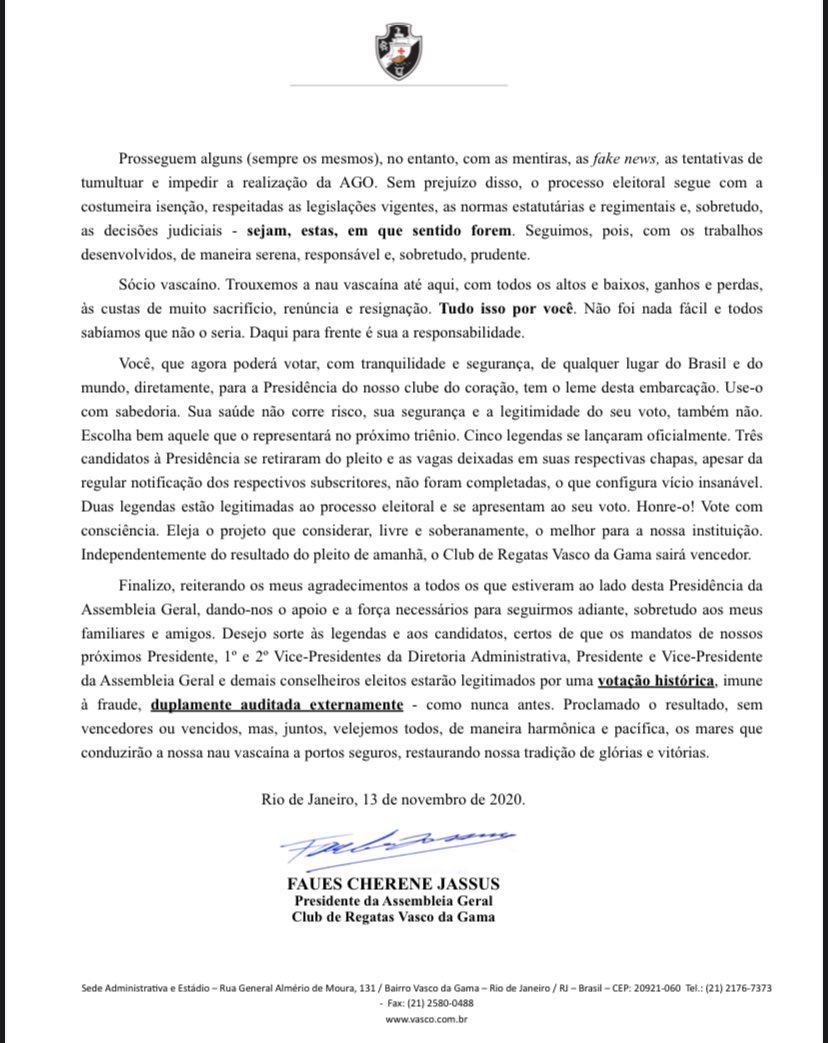 Presidente da Assembleia Geral, Faues Mussa divulga nota agradecendo aos sócios e torcedores do Vasco. Ele reafirmou que o sistema é seguro e imune a fraudes, e disse que a Eleja foi duplamente auditada. Confira na íntegra: