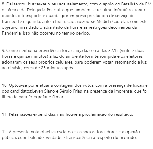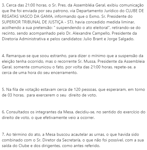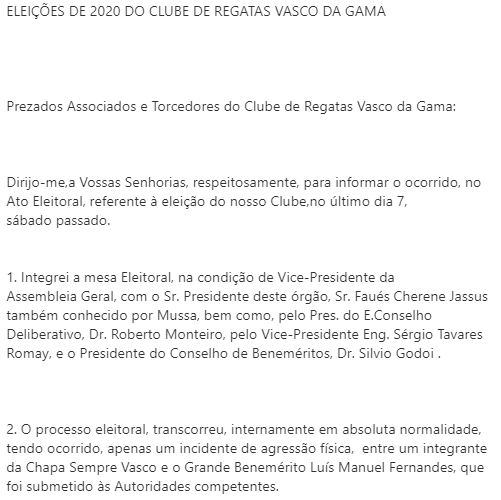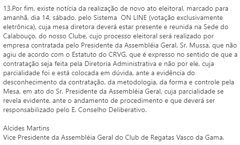 Minutos depois de Mussa, presidente da Assembleia Geral do Vasco, manifestar-se em nota, o vice da mesma AG, Alcides Martins, também fez seu comunicado. Em 13 tópicos, fez inúmeras críticas a Mussa e disse que o pleito marcado para amanhã (sábado) não será imparcial. Veja. #gevas