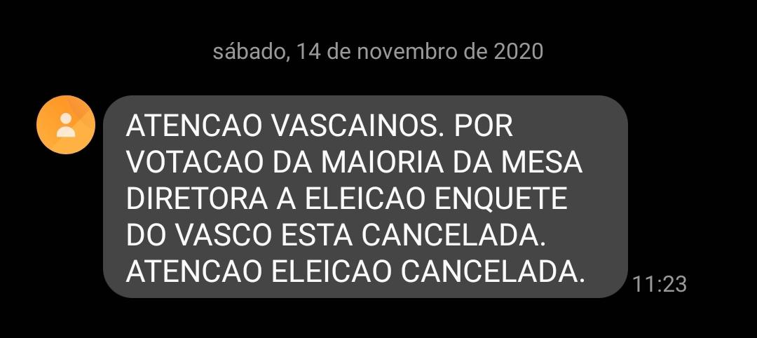 Alguns sócios estão recebendo SMS dizendo que a eleição do Vasco tá cancelada. A informação não é correta e segue ate 22hs #VascoENM