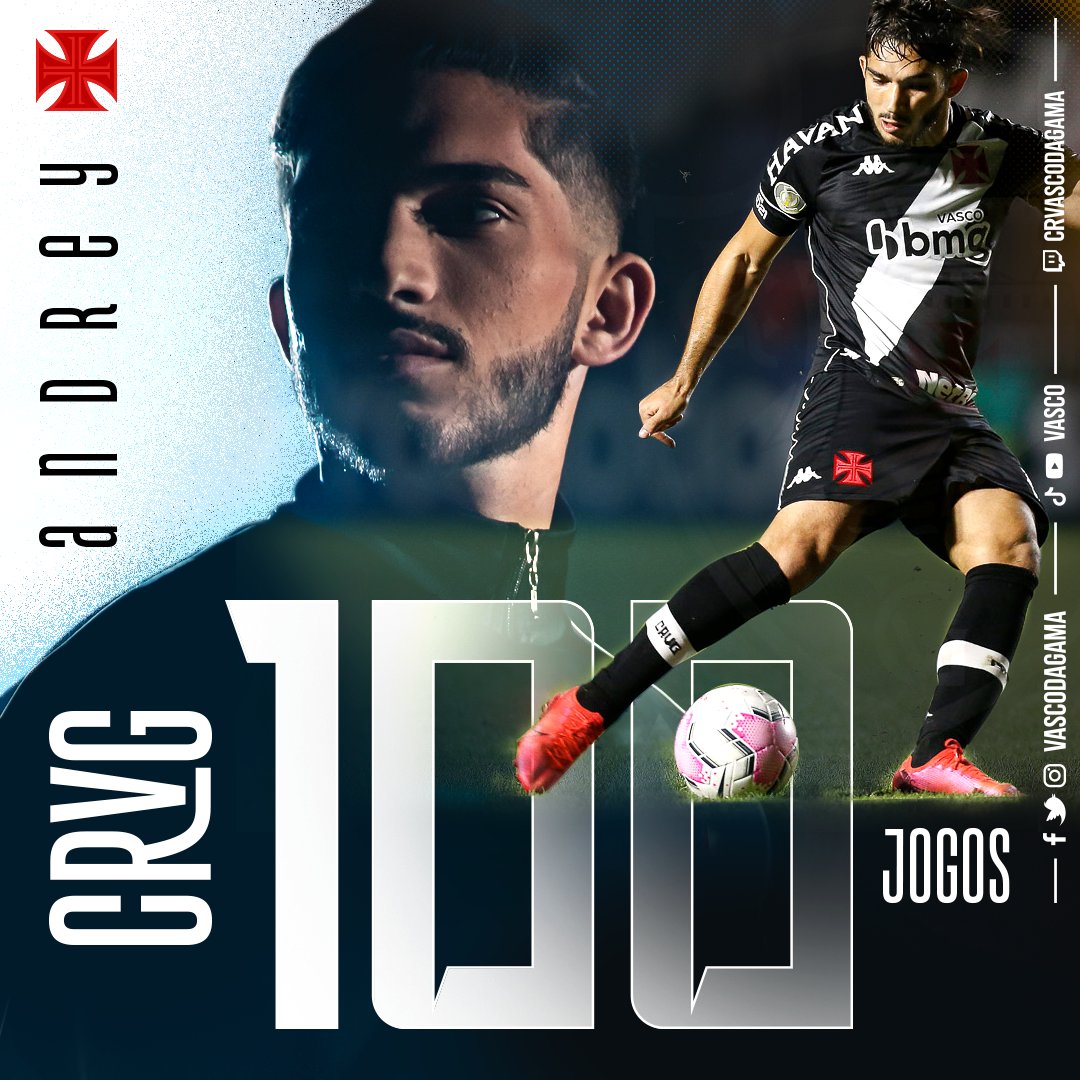 O meia @AndreyRamos98 completa 100 jogos com a camisa do Vasco.