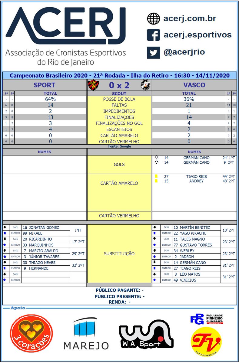Scout Final de Sport e Vasco pela 21ª Rodada do Campeonato Brasileiro 2020 na Ilha do Retiro #Brasileirao2020 #acerjinforma #SPTxVAS