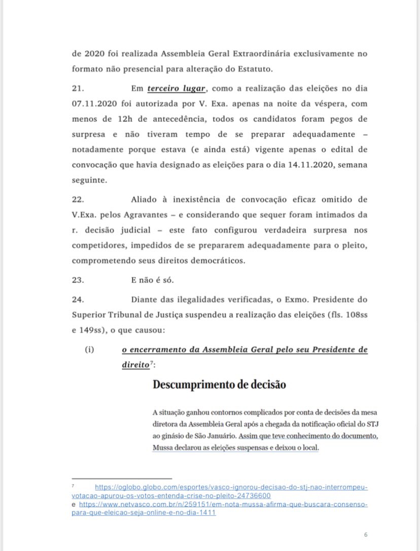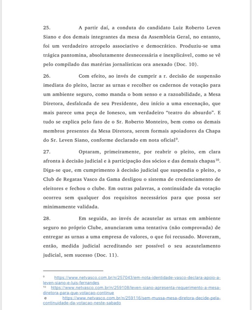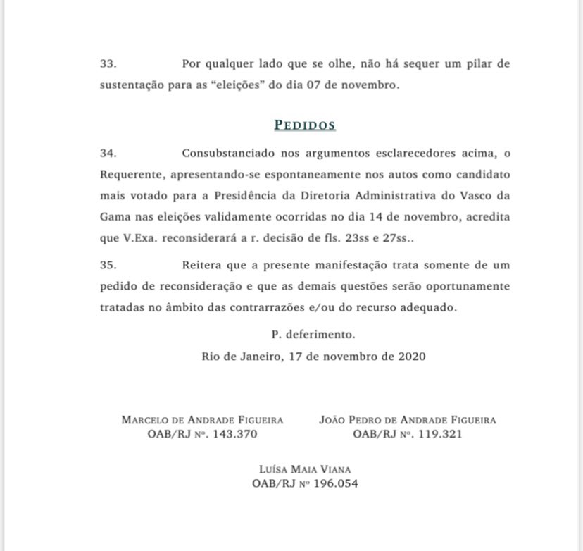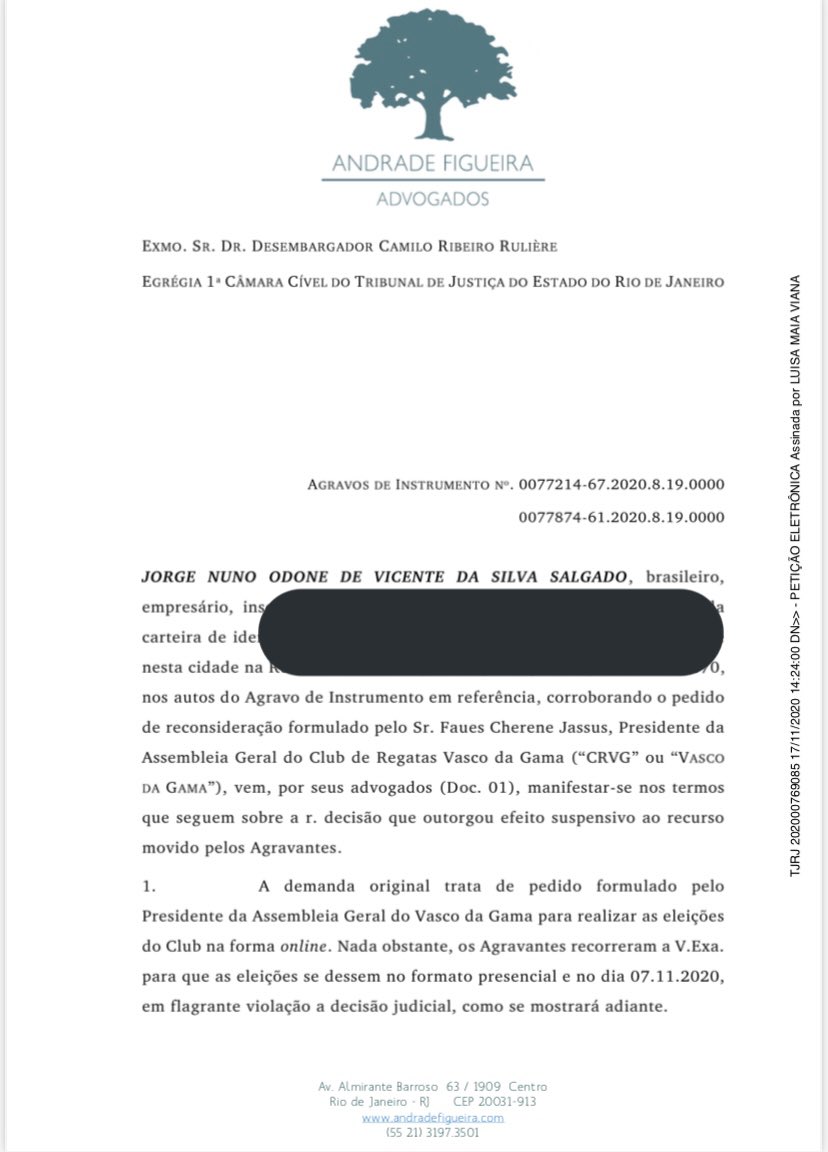 ⚠️ Tive acesso à íntegra da ação que Jorge Salgado, da Mais Vasco, ingressou na justiça pedindo ao desembargador Camillo Rullière que reconsidera sua decisão após o ele conceder a liminar que deu o direito das eleições do Vasco acontecerem no dia 7/11, de forma presencial: