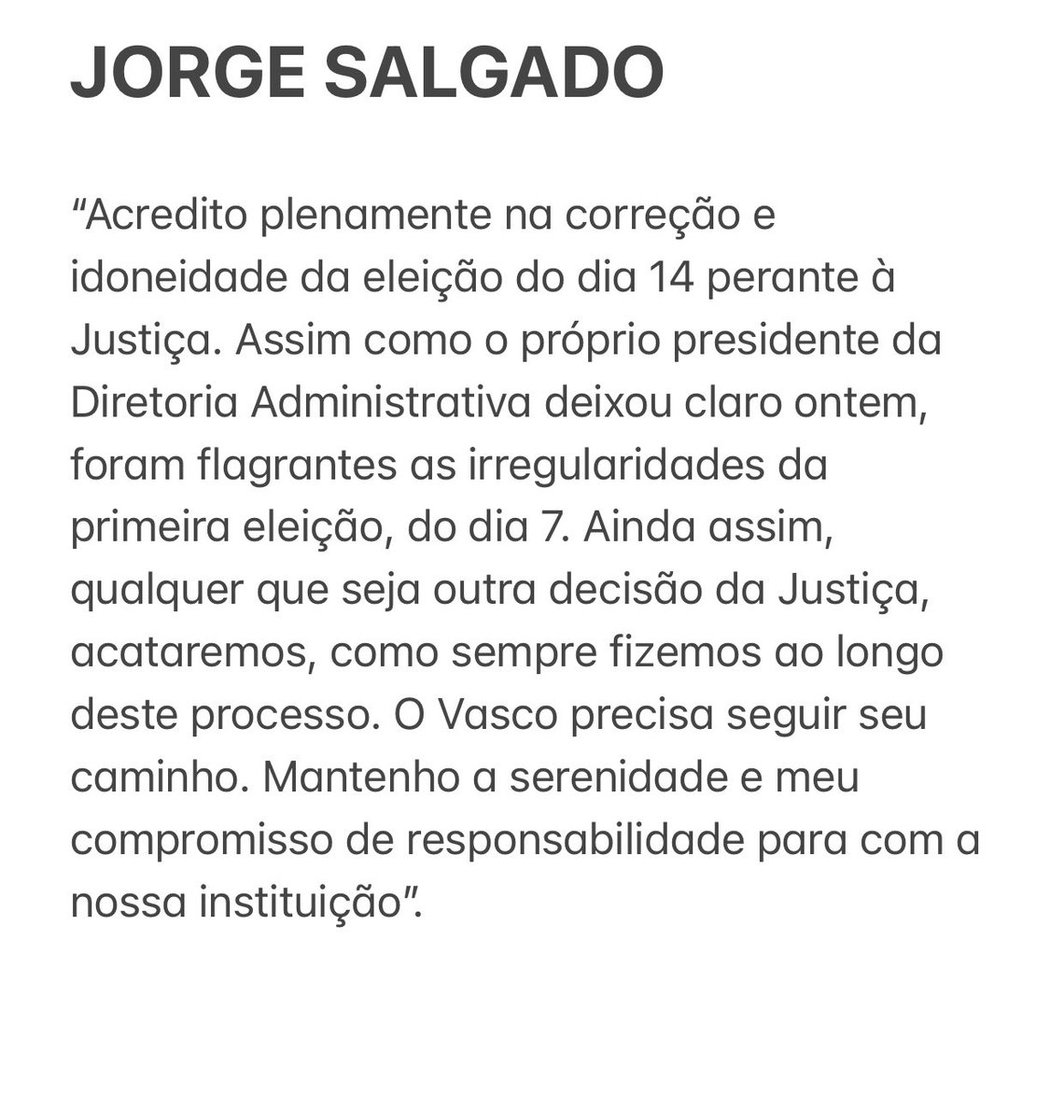 Jorge Salgado não concorda com nova eleição, mas diz que acatará decisão da Justiça