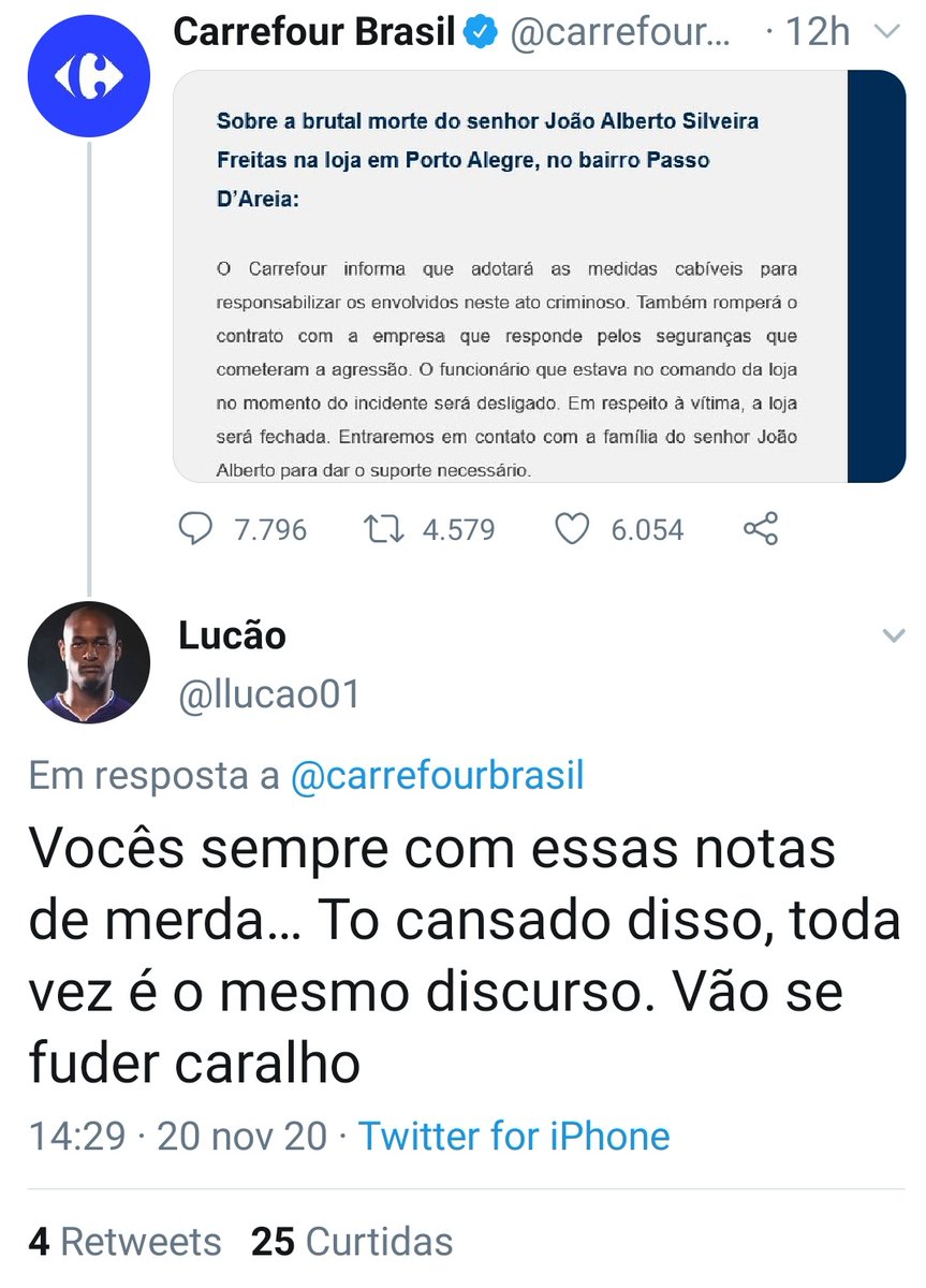 O Carrefour divulgou comunicado prometendo uma série de medidas diante da morte, como o encerramento do contrato com a empresa de segurança responsável pelos autores do crime e o fechamento da loja, em consideração à vítima. Mas Lucão não se conteve.