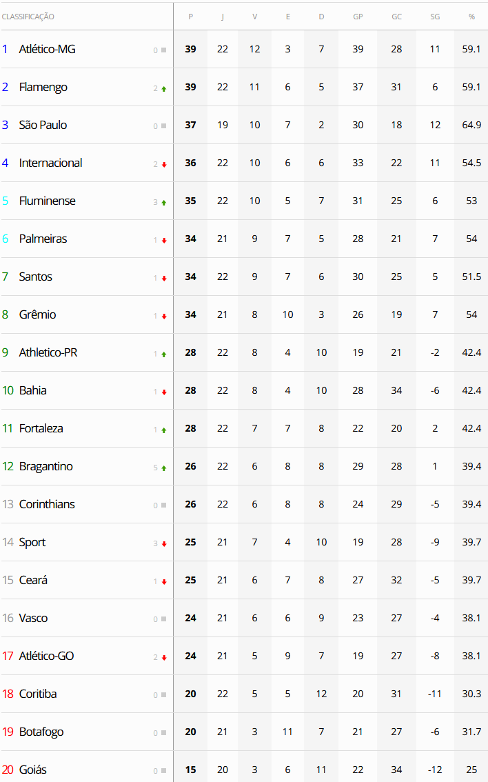 Terminados os jogos de domingo da 22ª rodada do Brasileiro, o Vasco, que empatou com o São Paulo por 1 a 1, está na 16ª posição. O Gigante da Colina, entretanto, ainda está sob risco de finalizar a rodada na zona do rebaixamento, o que só não acontecerá se o Atlético-GO perder para o Sport nesta 2ª-feira.