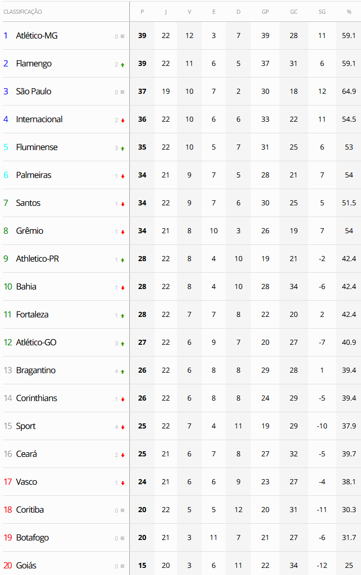 Terminada a 22ª rodada do Brasileiro, o Vasco, que empatou com o São Paulo por 1 a 1, caiu da 16ª para a 17ª posição, voltando a figurar no Z4, a zona do rebaixamento.