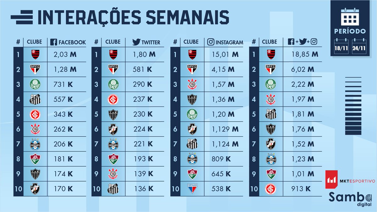 Em grande fase, o @SaoPauloFC se consolidou na 2ª posição geral. No Instagram, duas fotos após a vitória sobre o @Flamengo geraram 580 mil interações (14% do total na semana). ?
