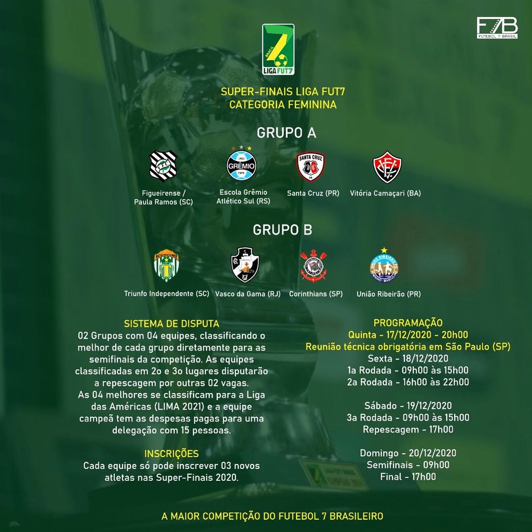 A Fase Final da Liga Fut7 Feminina reunirá gigantes da modalidade em São Paulo (SP). Serão dois grupos é uma disputa de altíssimo nível. Fique ligado nos confrontos. A tabela será divulgada na próxima segunda-feira.