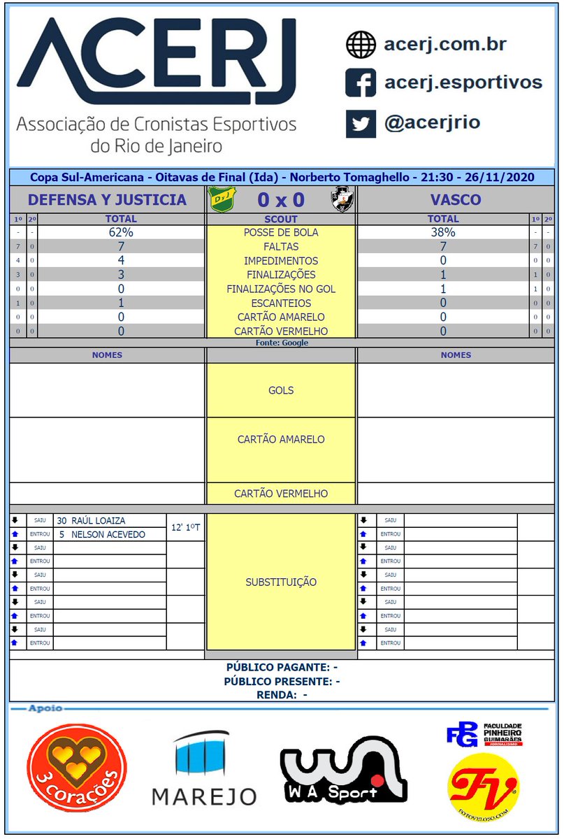 Scout do 1º Tempo de Defensa y Justicia e Vasco pelo jogo de ida das Oitavas de Final da Copa Sul-Americana 2020 (Fonte: Google) #acerjinforma #DYJxVAS #SulAmericana
