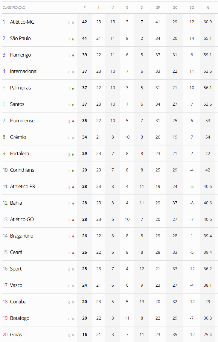 Veja a classificação do Brasileiro após os jogos de sábado da 23ª rodada