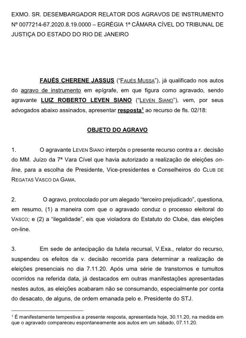 Nesta manhã o presidente da Assembleia Geral, Faues Mussa, teve sua petição de contrarrazões protocolada na 1ª Câmara Cível do RJ. Essa defesa tem o intuito de anular o pleito do dia 7 de novembro e marcar uma nova eleição. ( )