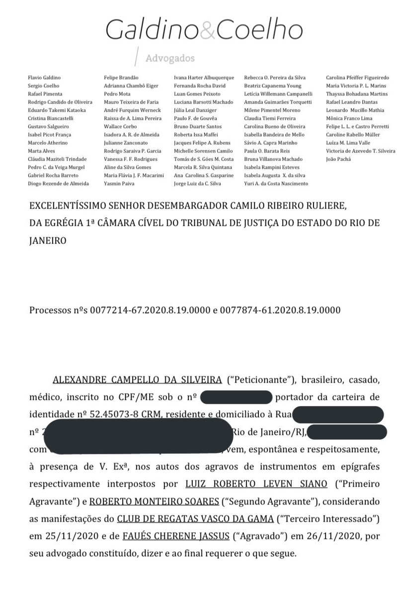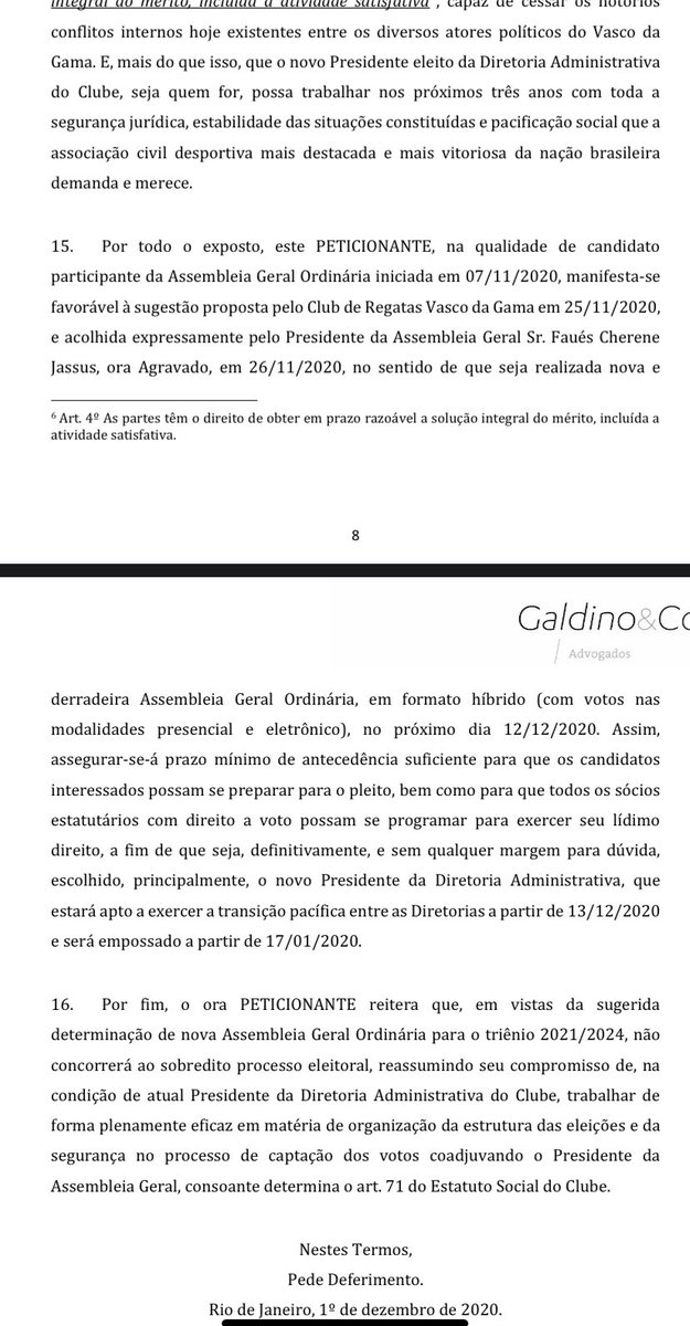 Nesta tarde, há pouco, o presidente Alexandre Campello, como pessoa física, entrou com uma petição intermediária, também na 1ª Câmara Cível, solicitando a marcação de novas eleições para o dia 12 de dezembro, como o Vasco já havia solicitado e o próprio Faues Mussa também. (+)