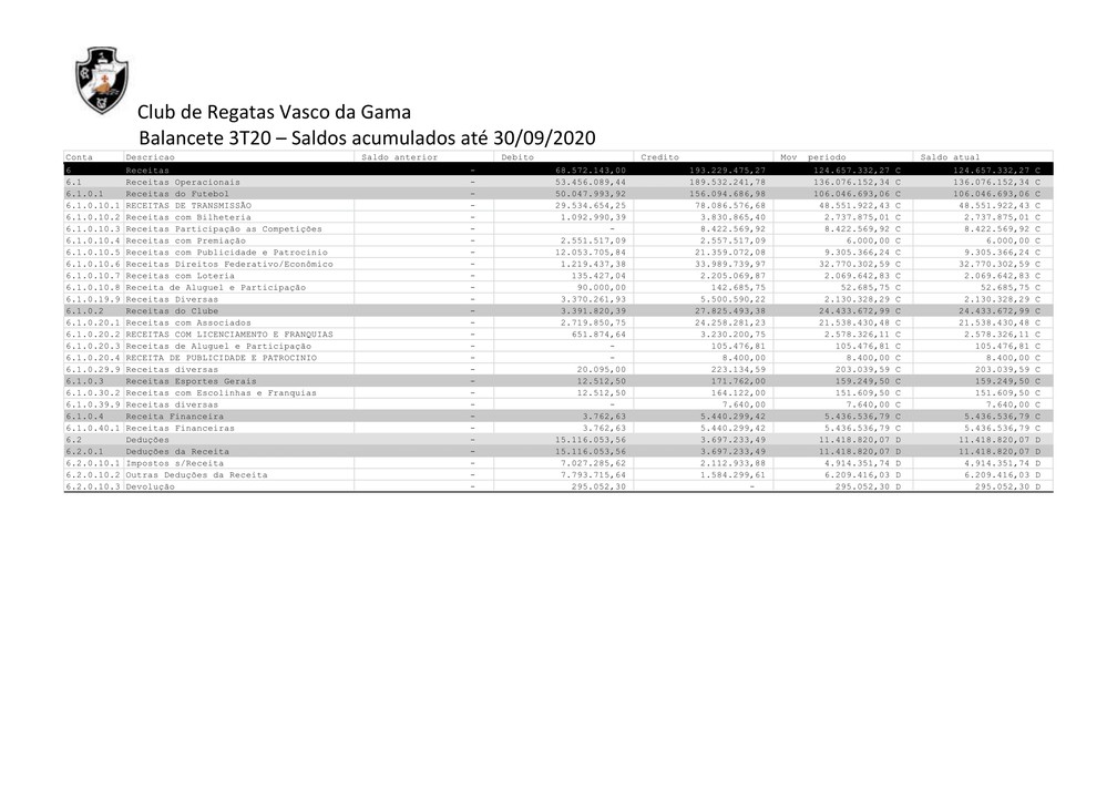 O orçamento do Vasco para 2020 previa arrecadação bem superior a do último ano (R$ 208 milhões). A diretoria colocou no orçamento R$ 324 milhões de receitas bruta, com R$ 310 milhões líquida. Até o fechamento do terceiro trimestre, esses valores chegaram a R$ 124,6 milhões, bem distante do estimado.