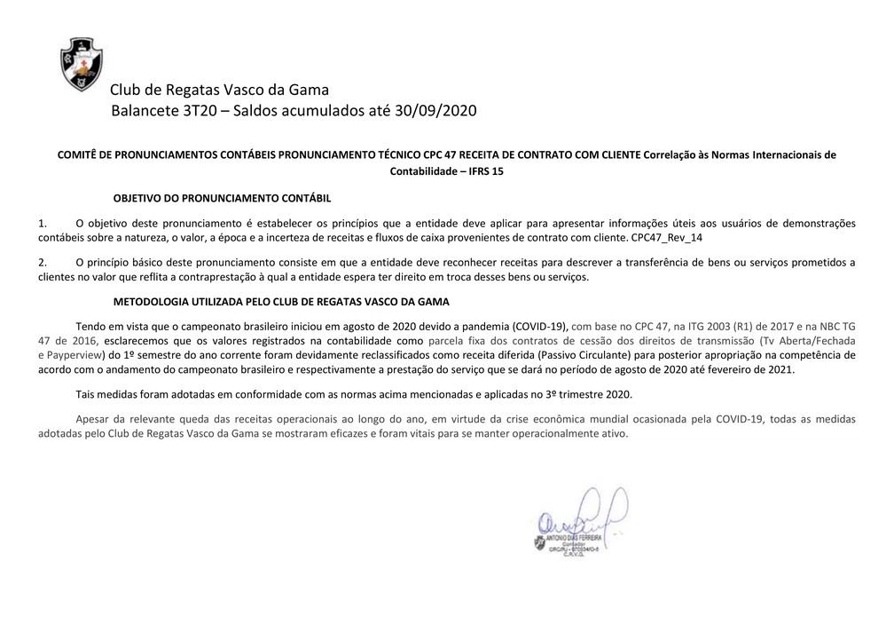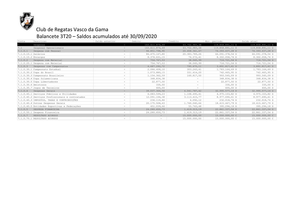 Com a pandemia, o Vasco – e os demais clubes brasileiros – ficaram isentos de cobranças do Profut e do ato trabalhista, dois parcelamentos de longas dívidas. O respiro – somado às vendas e outras receitas - permitiu ao Vasco aliviar as combalidas contas. Com R$ 119,8 milhões de despesas e R$ 124,6 de receitas, o clube registrou superávit de cerca de R$ 5 milhões.