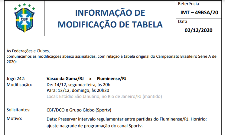 CBF antecipa Vasco x Fluminense de 14/12, 2ª-feira, às 20h, para 13/12, domingo, às 20h30