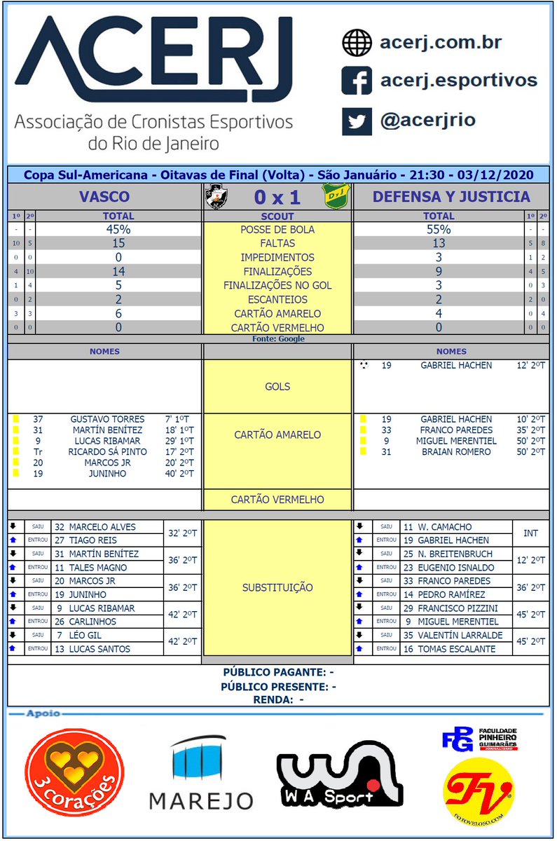 Cartões amarelos: Benítez, Gustavo Torres, Marcos Júnior e Ribamar (Vasco); Haachen, Merentiel e Paredes (Defensa Y Justicia)