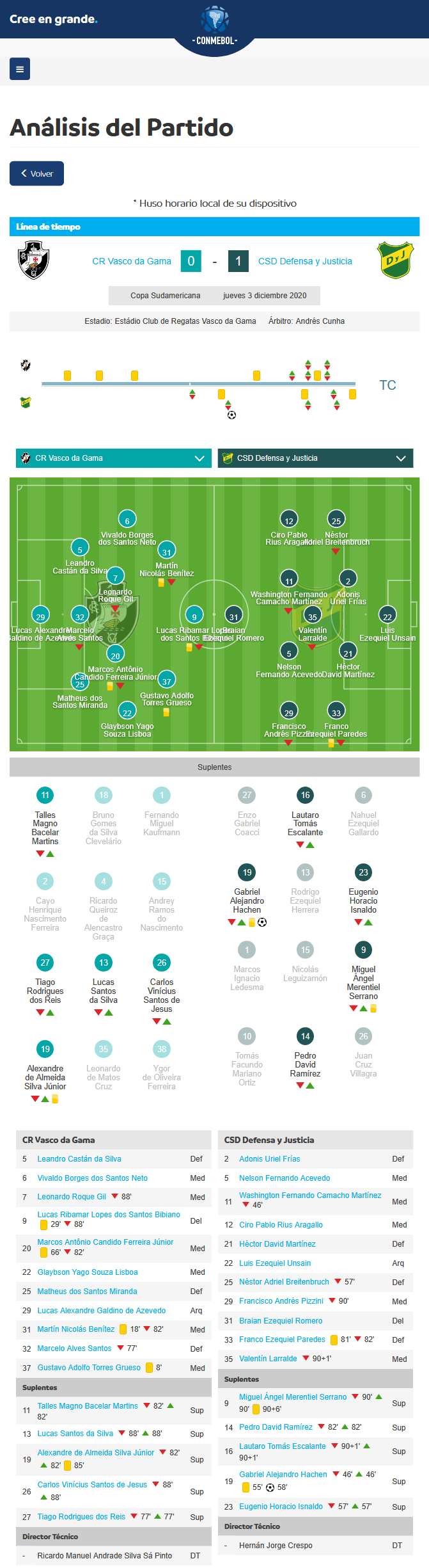 Confira o relatório da Conmebol de Vasco 0 x 1 Defensa y Justicia