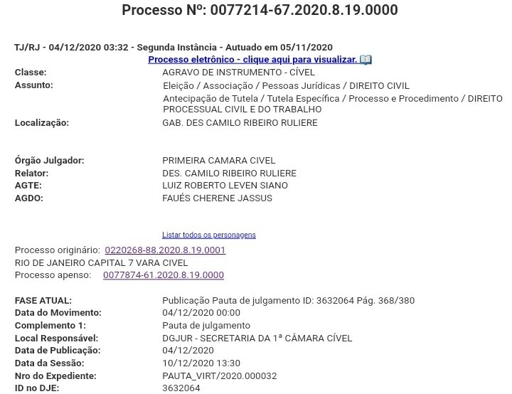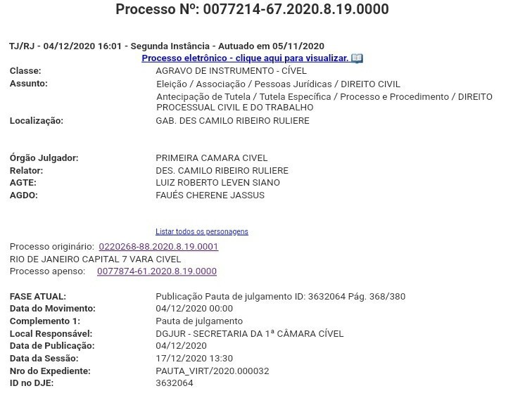 A sessão do dia 17 é a última sessão dos desembargadores da Primeira Câmara Cível do TJRJ antes do recesso do Judiciário, que vai do próximo dia 20 até o dia 6 de janeiro de 2021. Estão marcados para este dia os julgamentos de 271 processos nesta Câmara. Os recursos da eleição estão nas posições 26 e 27.