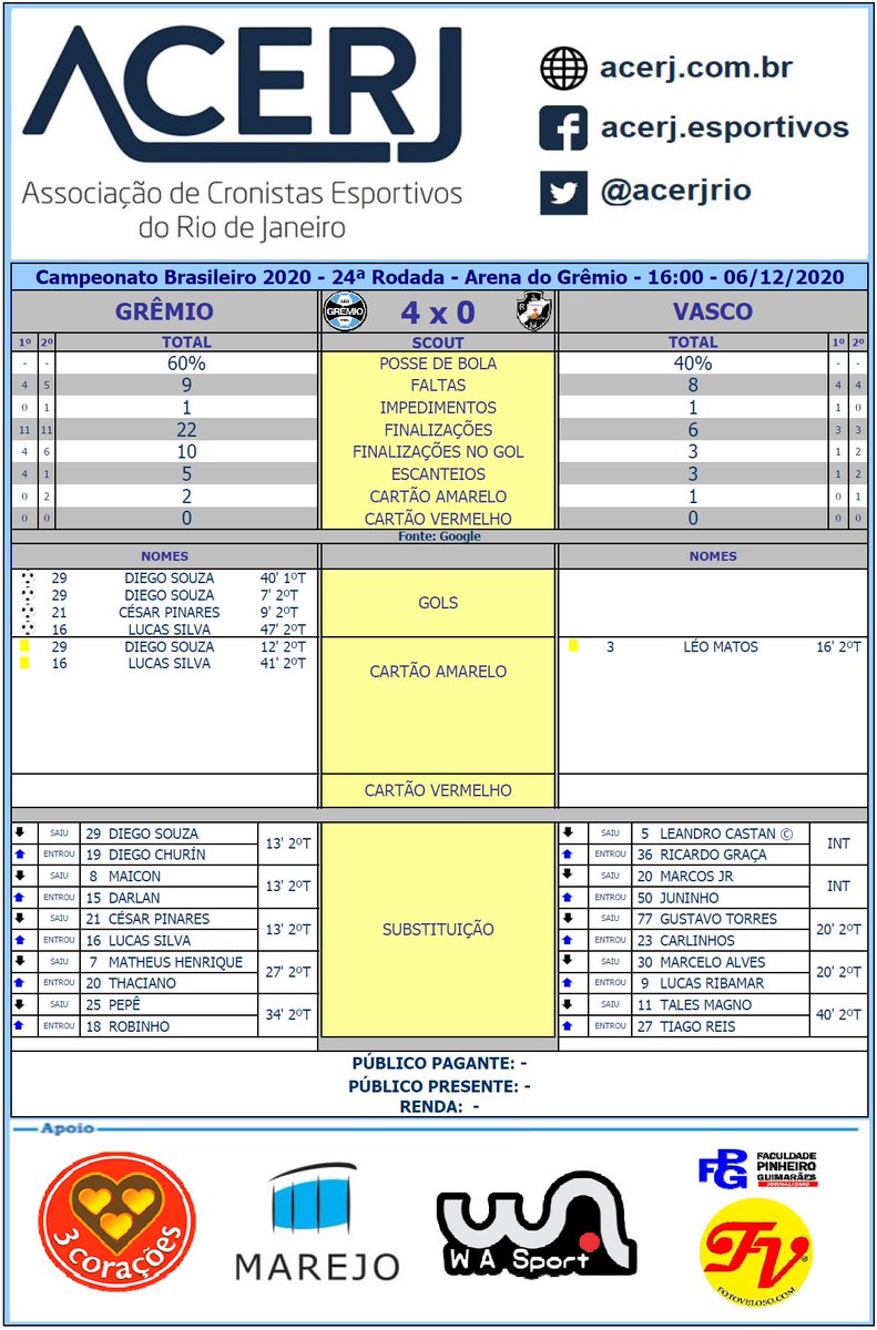 Cartões amarelos: Diego Souza, Lucas Silva (Grêmio); Léo Matos (Vasco)