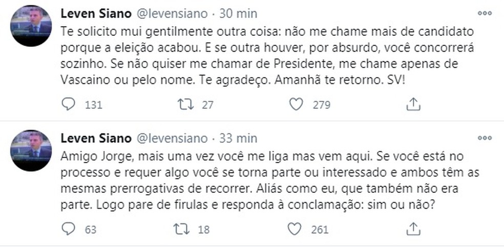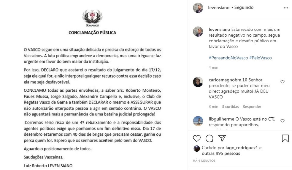 A eleição que vai definir o novo presidente do Vasco está judicializada. Uma votação presencial ocorreu em 7 de novembro, em São Januário, mas foi interrompida antes do fim devido a uma liminar do STJ. Na ocasião, Leven Siano, da chapa Somamos, foi o mais votado.
