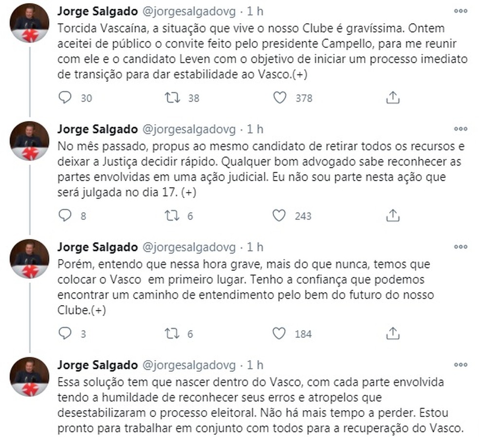 Depois de anunciar publicamente que conversou com Luiz Roberto Leven Siano e Jorge Salgado, os candidatos mais votados nas eleições presencial e online, respectivamente, Campello deu o pontapé inicial na transição. Foi agendado para quarta o encontro com Leven. Ainda não há data para o encontro com Salgado.