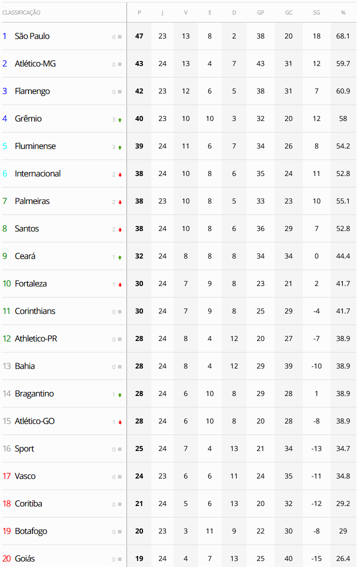 Terminada a 24ª rodada do Brasileiro, o Vasco, que perdeu para o Grêmio por 4 a 0, manteve-se na 17ª posição, permanecendo no Z4, a zona do rebaixamento.