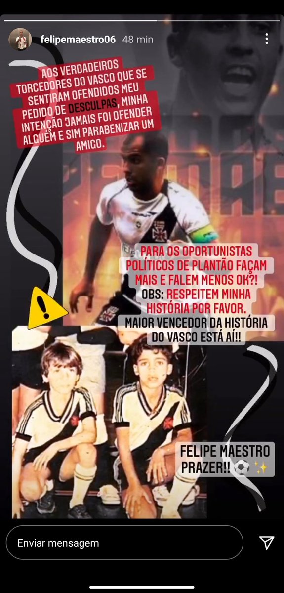 O ídolo Felipe, o Maestro, usou os stories do Instagram para rebater as críticas que sofreu após parabenizar Diego Souza pelos gols contra o Vasco na última partida.
