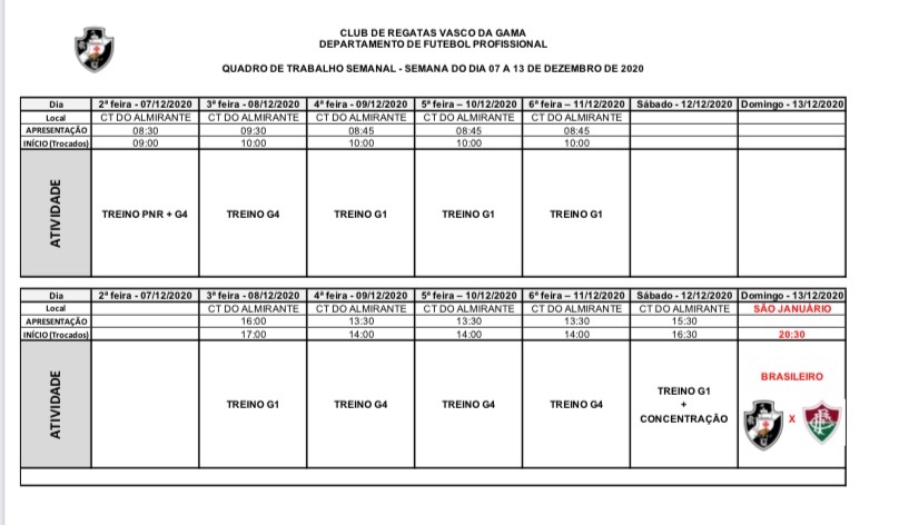 Esta é a programação de treinos do Vasco para o clássico com o Fluminense. Entendam como "G1" o elenco principal e como "G4" o grupo composto pelos quatro jogadores que treinam separadamente: Felipe Bastos, Bruno Cosendey, Rafael França e Togo Felipe. PNR: para não relacionados.
