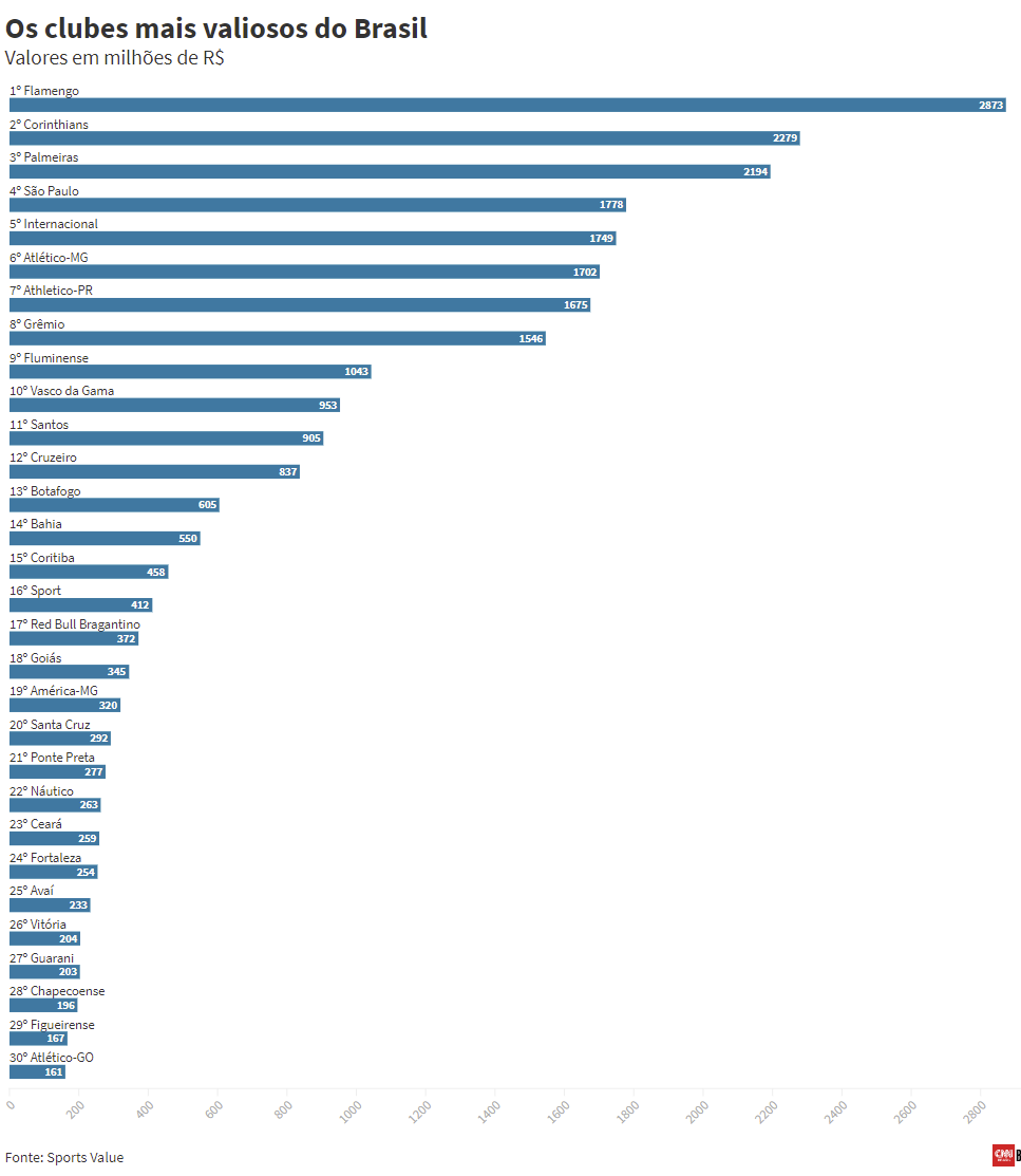 Os 30 clubes mais valiosos do futebol brasileiro possuem valor de mercado somado de R$ 25,1 bilhões. A nível de comaparação, o Real Madrid, sozinho, vale aproximadamente R$ 21,7 bilhões. Dallas Cowboys, da NFL, tem valor aproximado de R$ 28,18 bilhões.