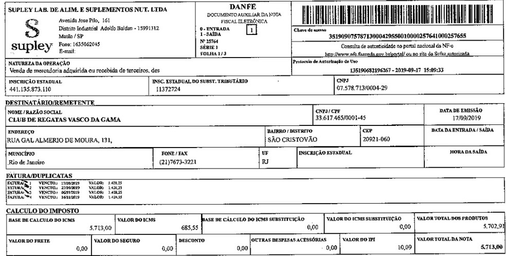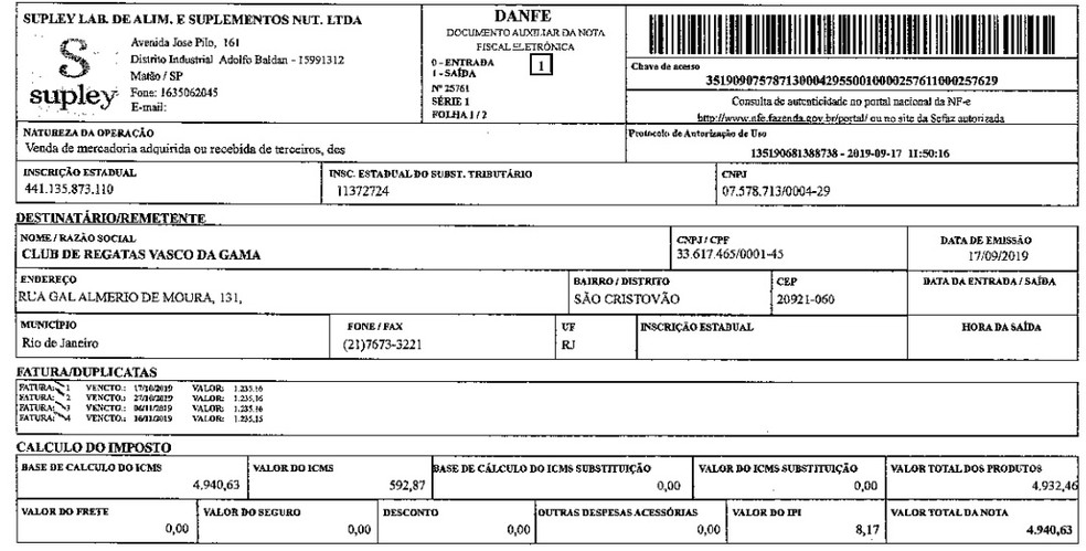O Supley Laboratório de Alimentos e Suplementos Nutricionais Ltda, da cidade de Matão, em São Paulo, vendeu os produtos ao Vasco em 17 de setembro de 2019, ou seja, já na gestão do atual presidente Alexandre Campello. Sem sucesso na tentativa de receber, a empresa optou pelo processo judicial pouco mais de um ano depois.