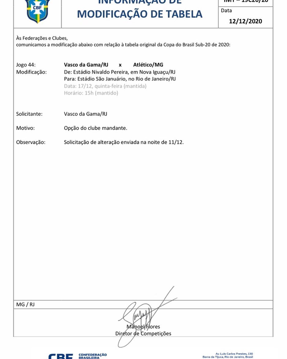 A Diretoria de Competições da CBF divulgou, neste sábado (12), uma mudança na tabela original da Copa do Brasil Sub-20 de 2020. A partida entre Vasco da Gama e Atlético-MG passou para o Estádio São Januário, no Rio de Janeiro (RJ), por opção do time mandante. Data e horário seguem inalterados.