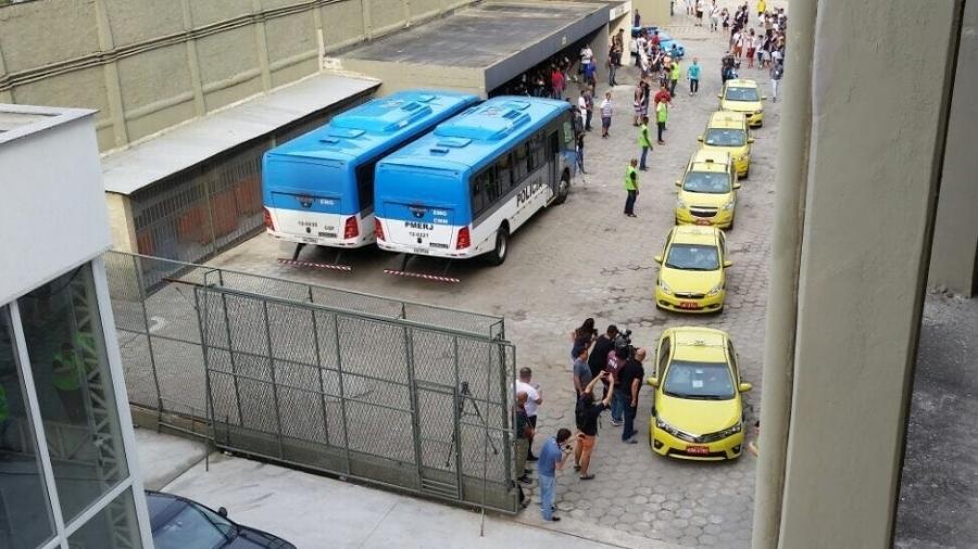 O comboio de táxis que chegou em São Januário cerca de uma hora antes da partida tinha ao menos sete veículos e causou surpresa aos torcedores que aguardavam a chegada do time no portão 9 do estádio.