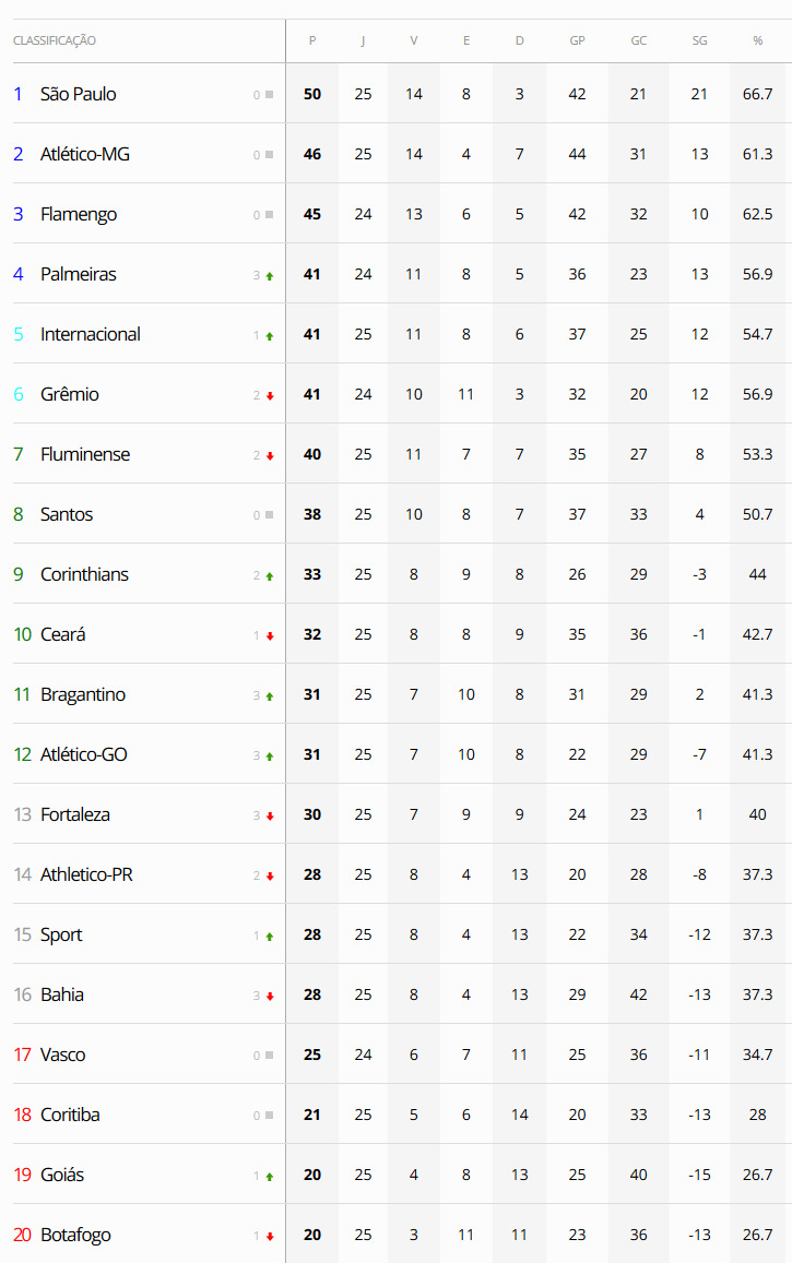 Terminada a 25ª rodada do Brasileiro, o Vasco, que empatou com o Fluminense por 1 a 1, manteve-se na 17ª posição, permanecendo no Z4, a zona do rebaixamento. O Gigante da Colina viu sua distância para o 16º colocado, o 1º time fora do Z4, subir de 1 para 3 pontos.