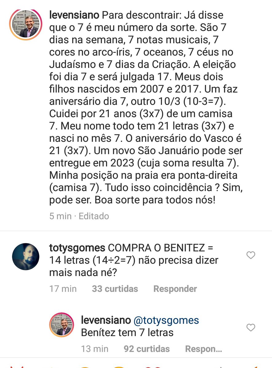 Leven Siano faz postagem no Instagram referente ao número 7 e também cita Benitez: