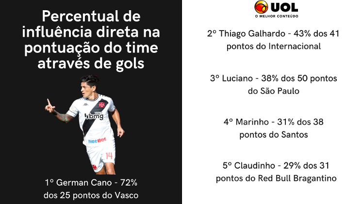 Foram computados na lista os gols que são responsáveis diretos por pontuação das equipes. Exemplo: o primeiro gol de uma vitória por 3x0, o gol da virada de um 3x1, ou o segundo gol do time num 2x2. Neste quesito, sem Cano, o Vasco teria apenas sete pontos no Brasileirão. Estaria virtualmente rebaixado.