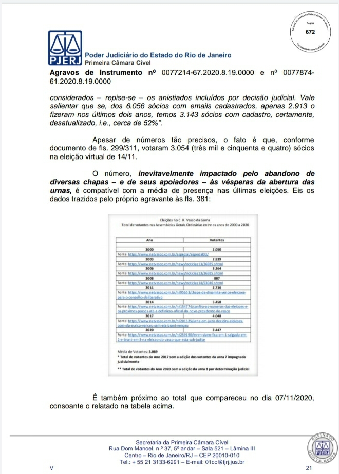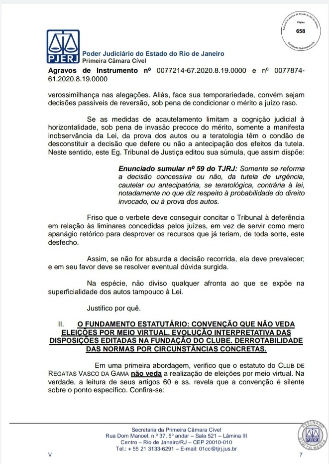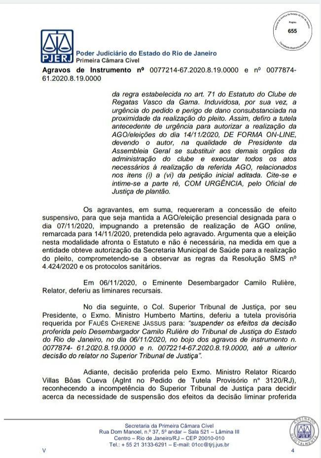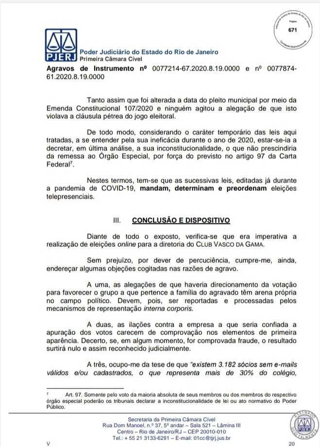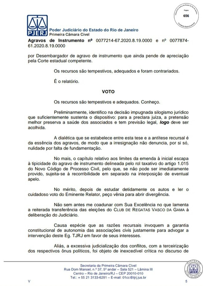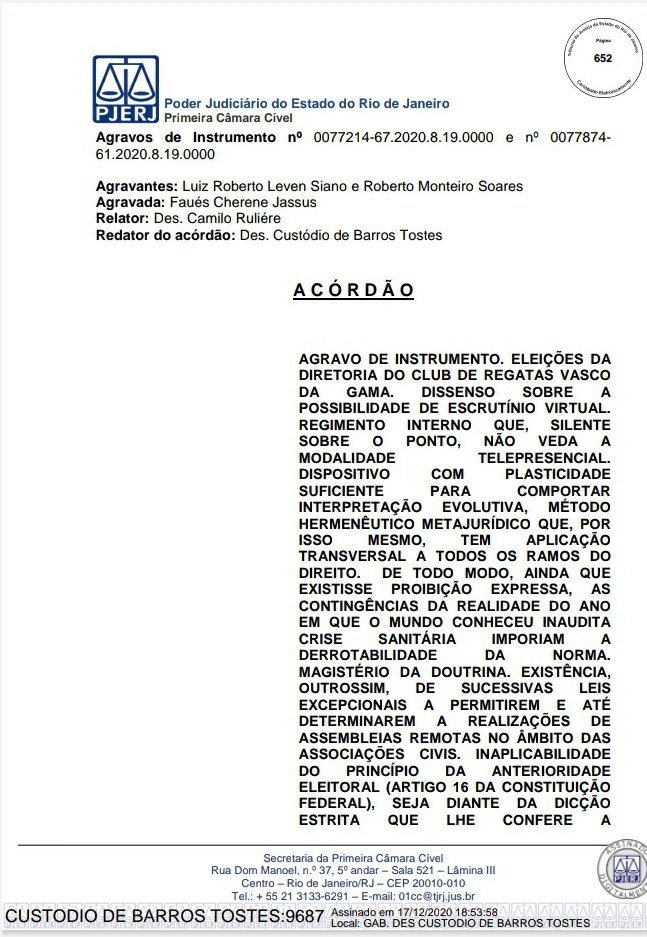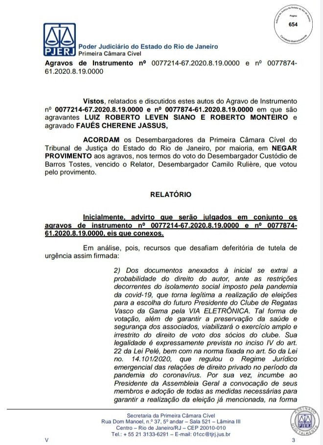A Primeira Câmara Cível do Tribunal de Justiça do Estado do Rio de Janeiro (TJRJ), por 2 a 1, rejeitou na tarde desta quinta-feira recursos de Leven Siano e Roberto Monteiro sobre a eleição presidencial do Vasco, o que fez Jorge Salgado ser confirmado como novo presidente. O voto do relator desembargador Camilo Ribeiro Rulière foi favorável a Leven e Monteiro, mas o desembargador Custódio de Barros Tostes divergiu e foi acompanhado pelo também desembargador Fábio Dutra. Na decisão de 22 páginas, ele apresenta argumentos que rebatem as teses de Leven e Monteiro, como a previsão de eleição online pelo estatuto do Cruz-Maltino, além de dados da pandemia de coronavírus, mais conhecida como Covid-19. Confira a seguir aqui no Esporte News Mundo a íntegra do voto!