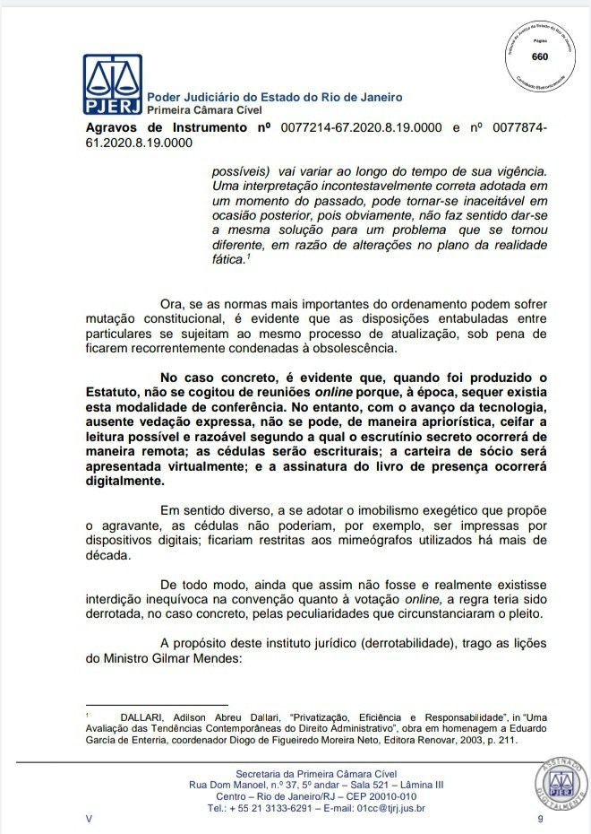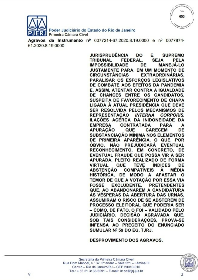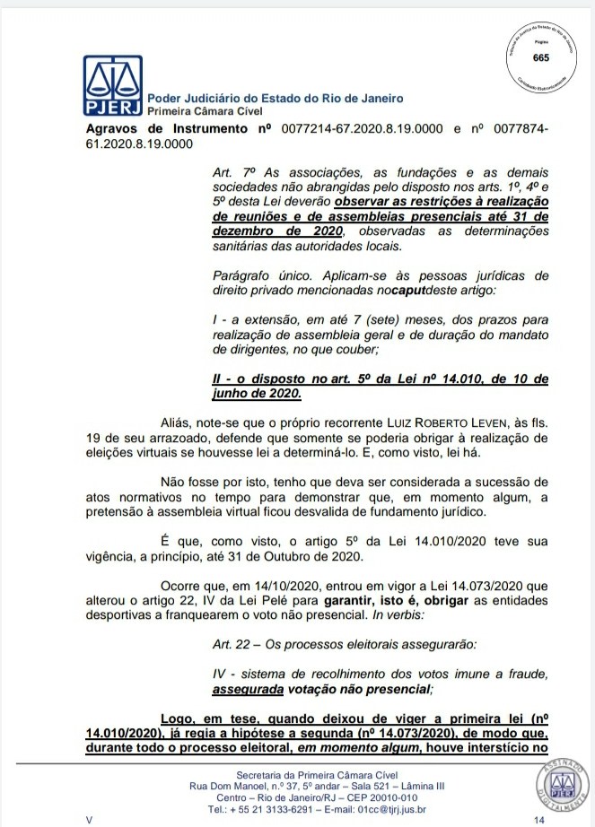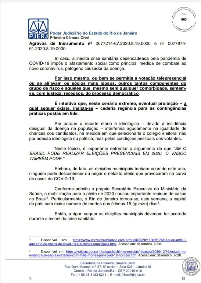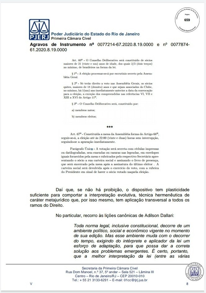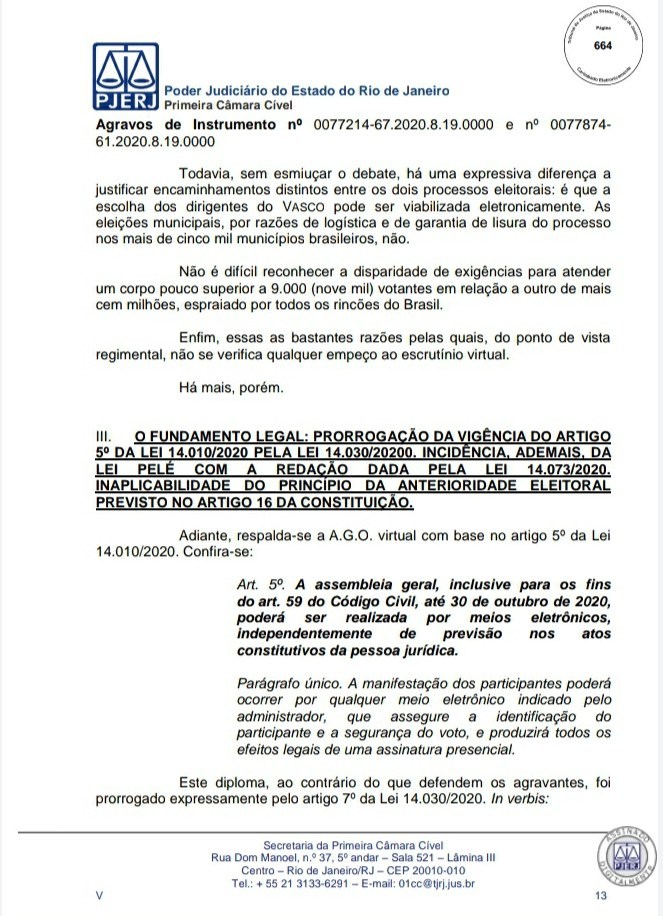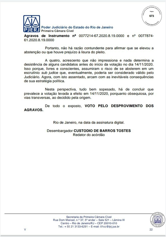 A Primeira Câmara Cível do Tribunal de Justiça do Estado do Rio de Janeiro (TJRJ), por 2 a 1, rejeitou na tarde desta quinta-feira recursos de Leven Siano e Roberto Monteiro sobre a eleição presidencial do Vasco, o que fez Jorge Salgado ser confirmado como novo presidente. O voto do relator desembargador Camilo Ribeiro Rulière foi favorável a Leven e Monteiro, mas o desembargador Custódio de Barros Tostes divergiu e foi acompanhado pelo também desembargador Fábio Dutra. Na decisão de 22 páginas, ele apresenta argumentos que rebatem as teses de Leven e Monteiro, como a previsão de eleição online pelo estatuto do Cruz-Maltino, além de dados da pandemia de coronavírus, mais conhecida como Covid-19. Confira a seguir aqui no Esporte News Mundo a íntegra do voto!