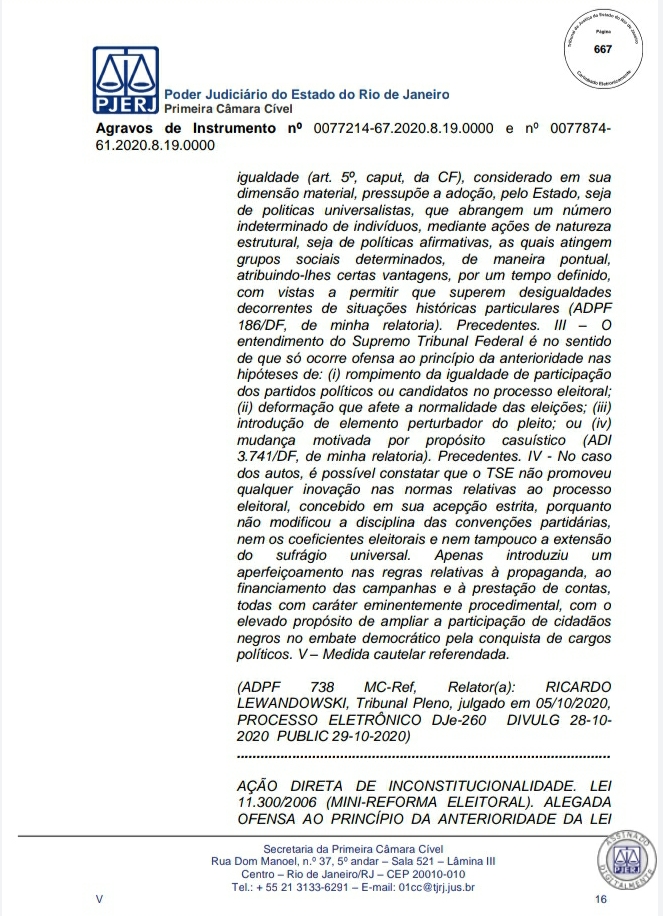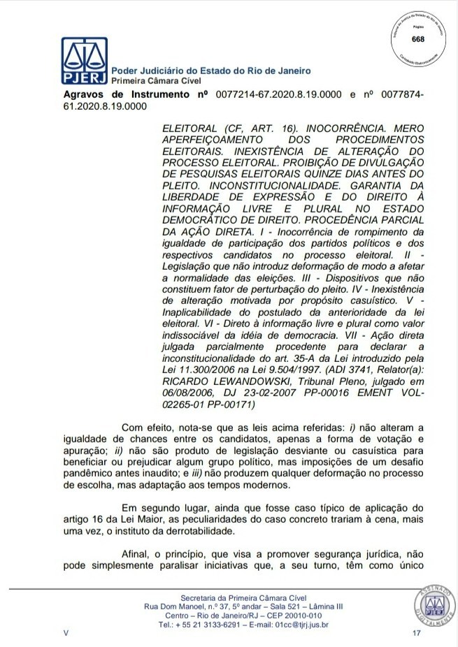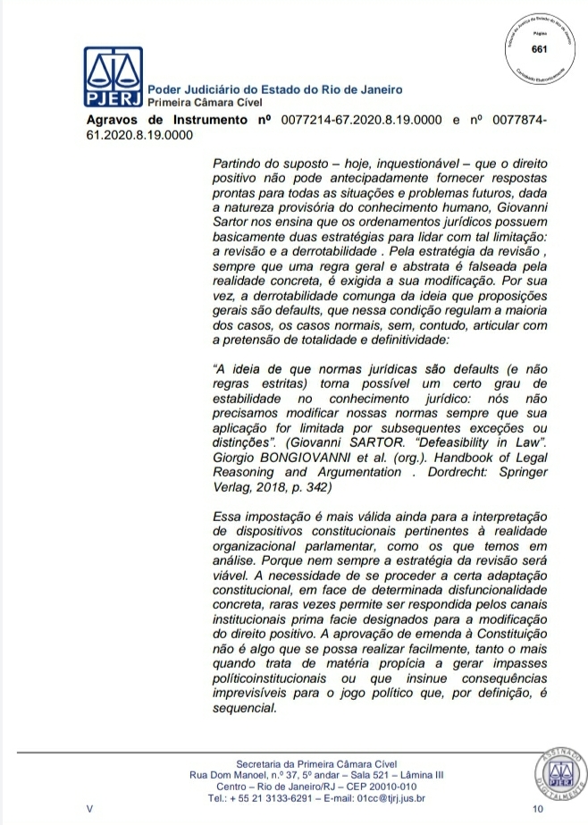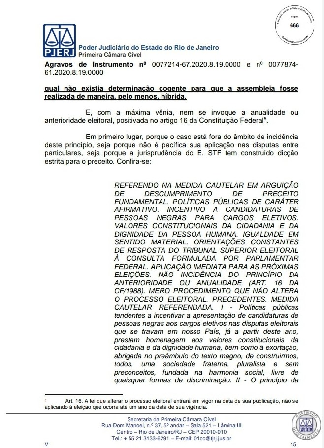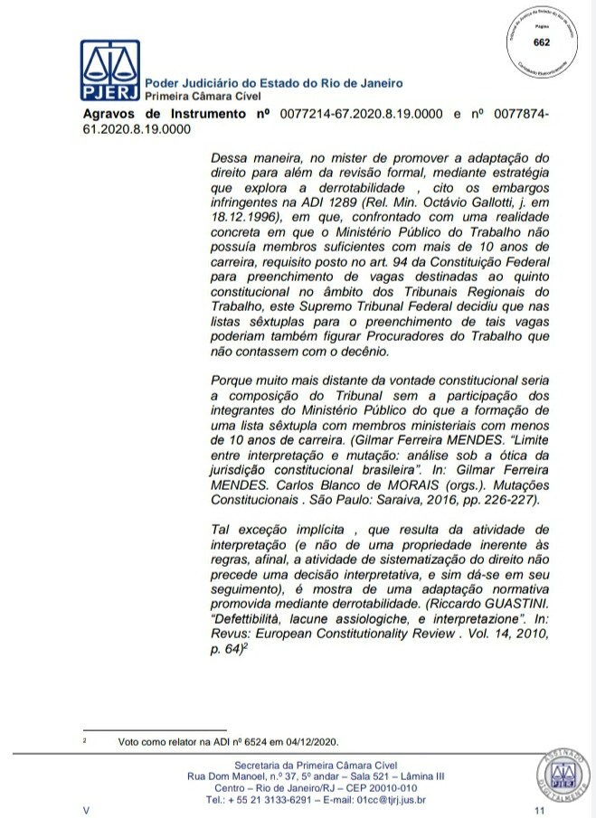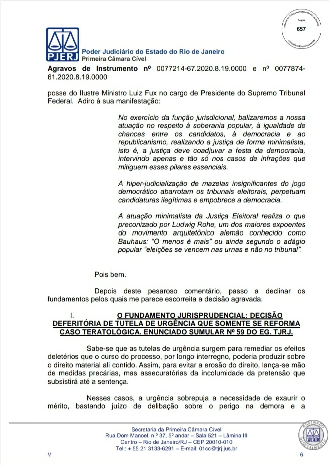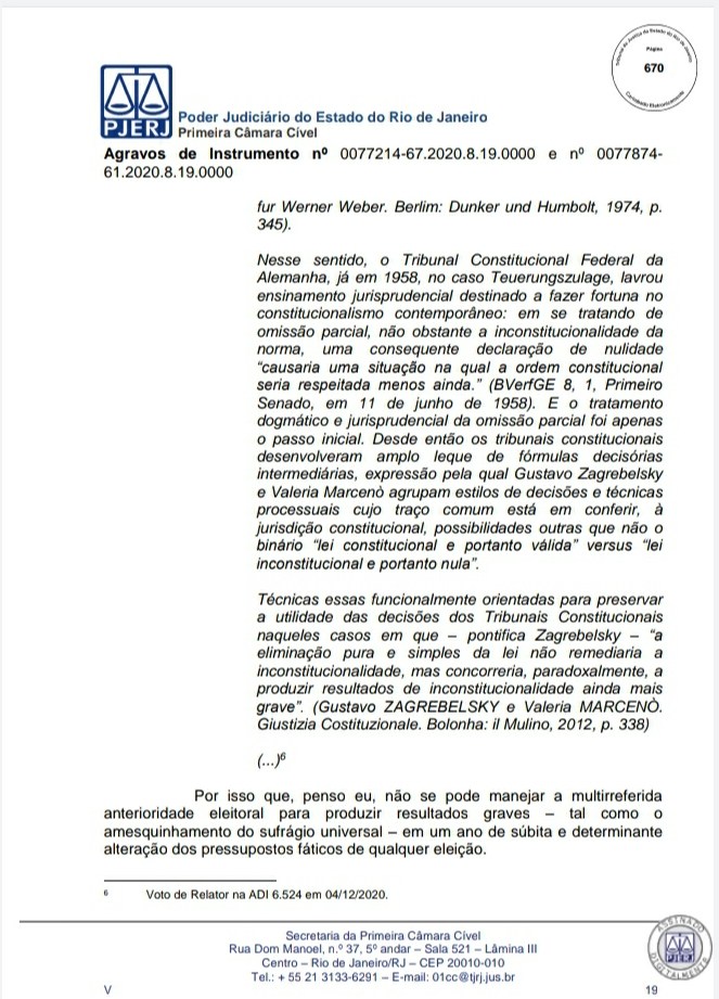 A Primeira Câmara Cível do Tribunal de Justiça do Estado do Rio de Janeiro (TJRJ), por 2 a 1, rejeitou na tarde desta quinta-feira recursos de Leven Siano e Roberto Monteiro sobre a eleição presidencial do Vasco, o que fez Jorge Salgado ser confirmado como novo presidente. O voto do relator desembargador Camilo Ribeiro Rulière foi favorável a Leven e Monteiro, mas o desembargador Custódio de Barros Tostes divergiu e foi acompanhado pelo também desembargador Fábio Dutra. Na decisão de 22 páginas, ele apresenta argumentos que rebatem as teses de Leven e Monteiro, como a previsão de eleição online pelo estatuto do Cruz-Maltino, além de dados da pandemia de coronavírus, mais conhecida como Covid-19. Confira a seguir aqui no Esporte News Mundo a íntegra do voto!