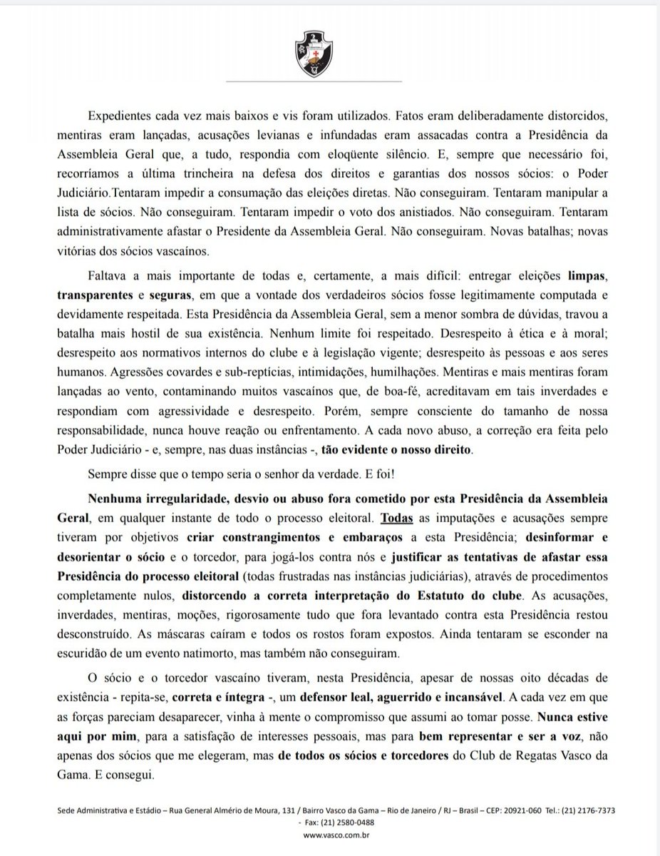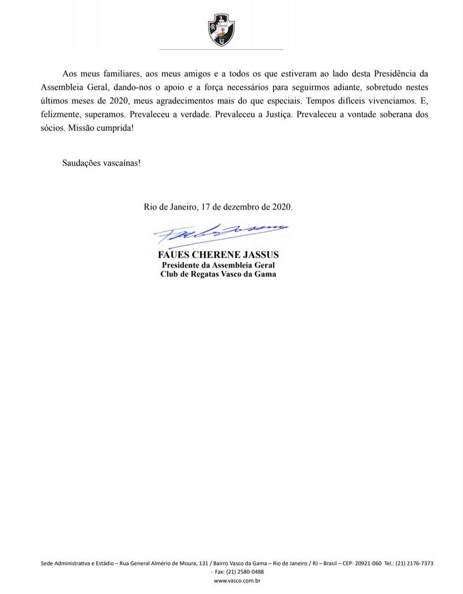Nota oficial de Faues Cherene Jassus, o Mussa, presidente da Assembleia Geral do Vasco, sobre a decisão desta quinta, que confirmou Jorge Salgado como presidente: 'Prevaleceu a verdade. Prevaleceu a Justiça. Prevaleceu a vontade soberana dos sócios', diz a nota. #VascoENM