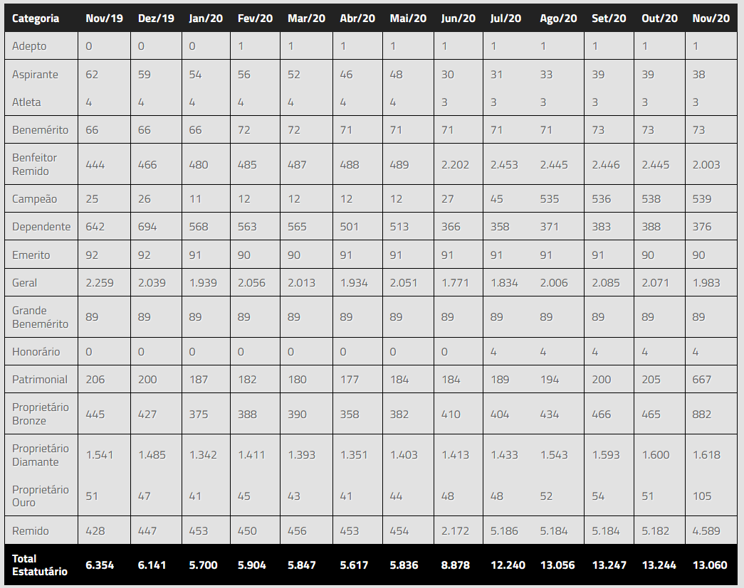 Veja abaixo a quantidade de sócios ativos no Gigante por categoria.