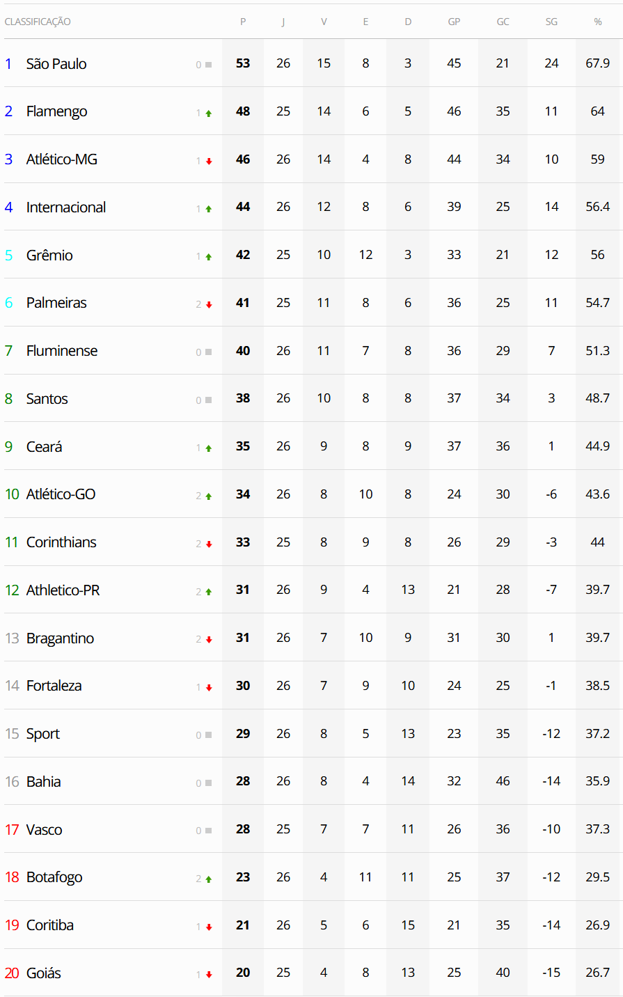Terminados os jogos do fim de semana da 26ª rodada do Brasileiro, o Vasco, que venceu o Santos por 1 a 0, manteve-se na 17ª posição, permanecendo no Z4, a zona do rebaixamento. O Gigante da Colina viu sua distância para o 16º colocado, o 1º time fora do Z4, cair de 3 pontos para 0 ponto.