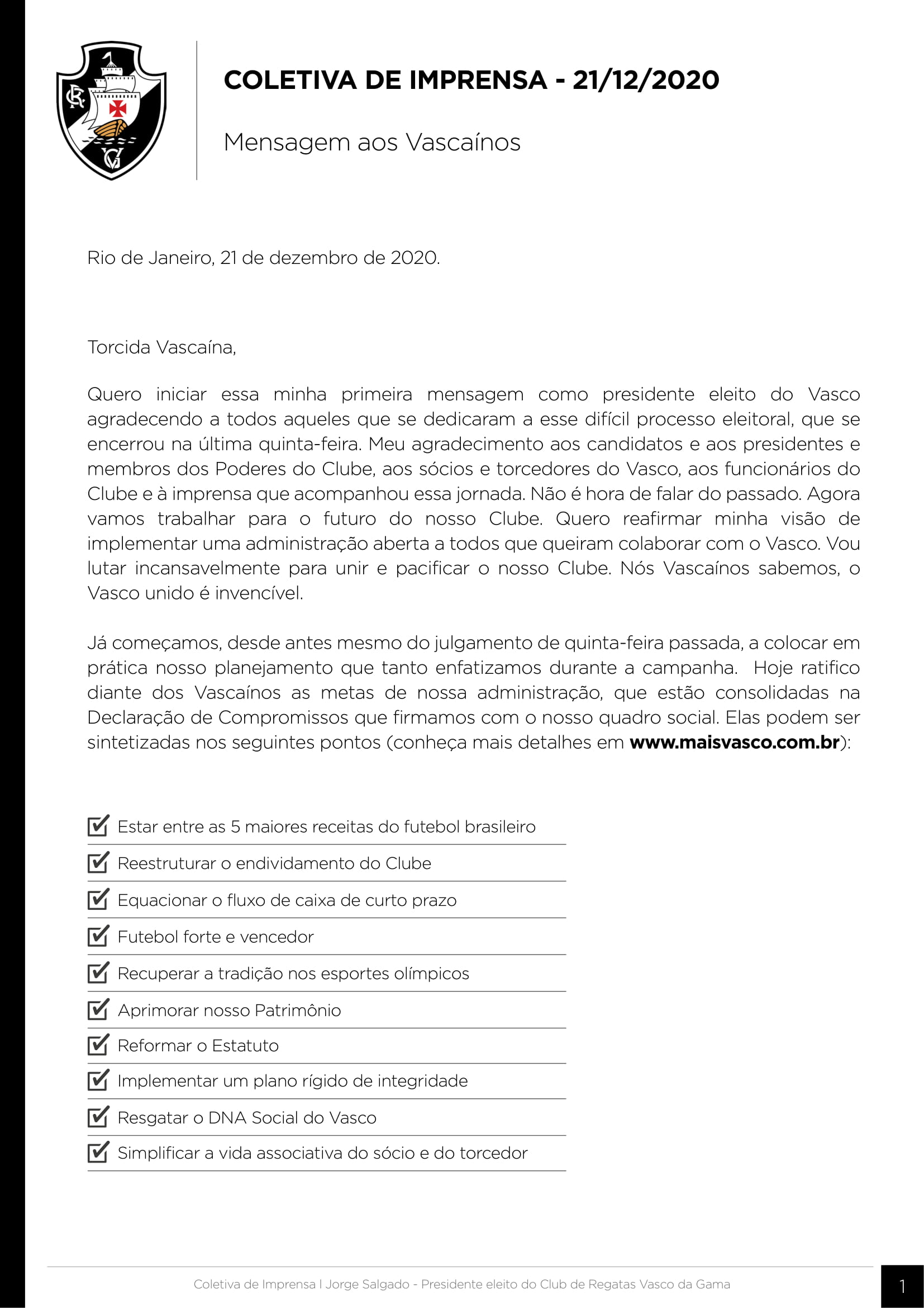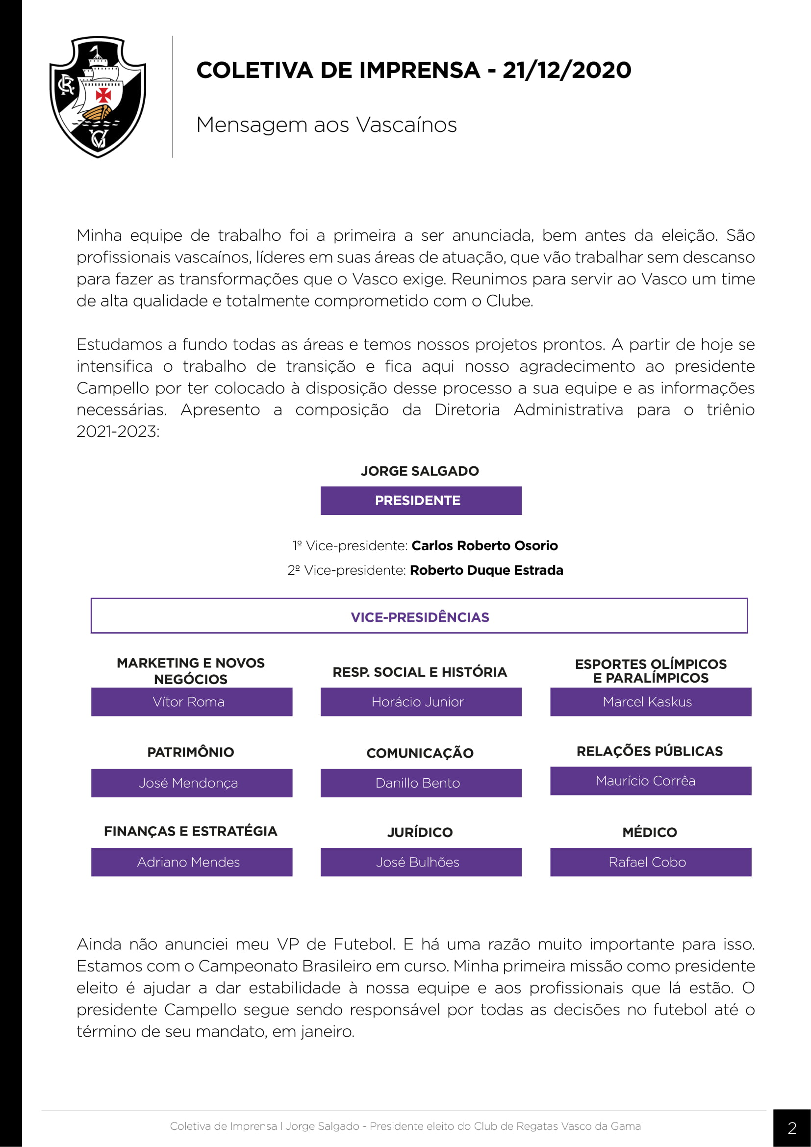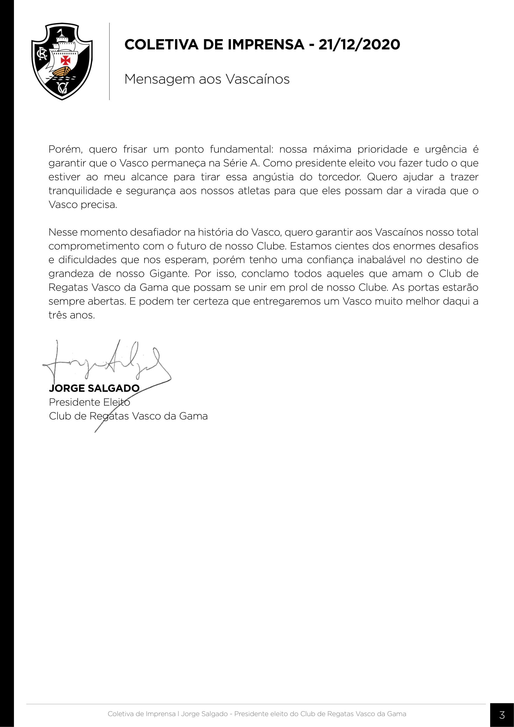Presidente eleito do Vasco, Jorge Salgado concedeu, na tarde desta segunda-feira, a sua primeira entrevista coletiva desde que a Justiça referendou a sua vitória. Ao lado de Alexandre Campello, atual mandatário, e Carlos Roberto Osório e Duque Estrada, de dois dos seus vices, em São Januário, o futuro comandante prometeu construir um novo Vasco, com finanças mais saudáveis e um time forte, nos próximos três anos.