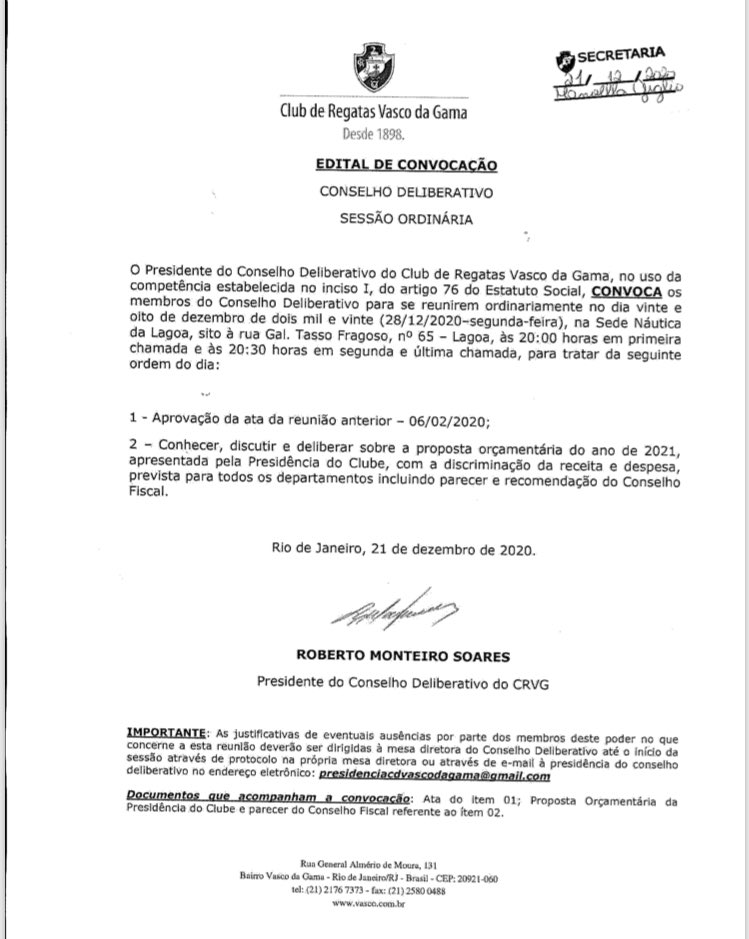 Roberto Monteiro convocou reunião do Conselho Deliberativo para o dia 28 de dezembro, às 20h, de maneira presencial.