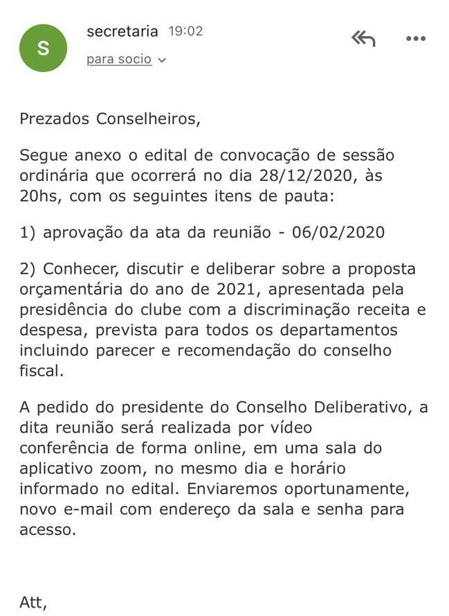 E-mail enviado pela Secretaria aos conselheiros informa que a reunião será online, via Zoom, a pedido de Roberto Monteiro, presidente do CD.