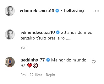 Ex-jogador e ídolo do Vasco, Pedrinho comentou post de Edmundo no Instagram sobre conquista do Tricampeonato Brasileiro de 1997: "Melhor do mundo 97", disse.