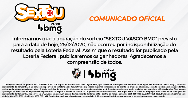 Vasco BMG não informou apuração do sorteio desta 6ª por indisponibilidade do resultado pela Loteria Federal