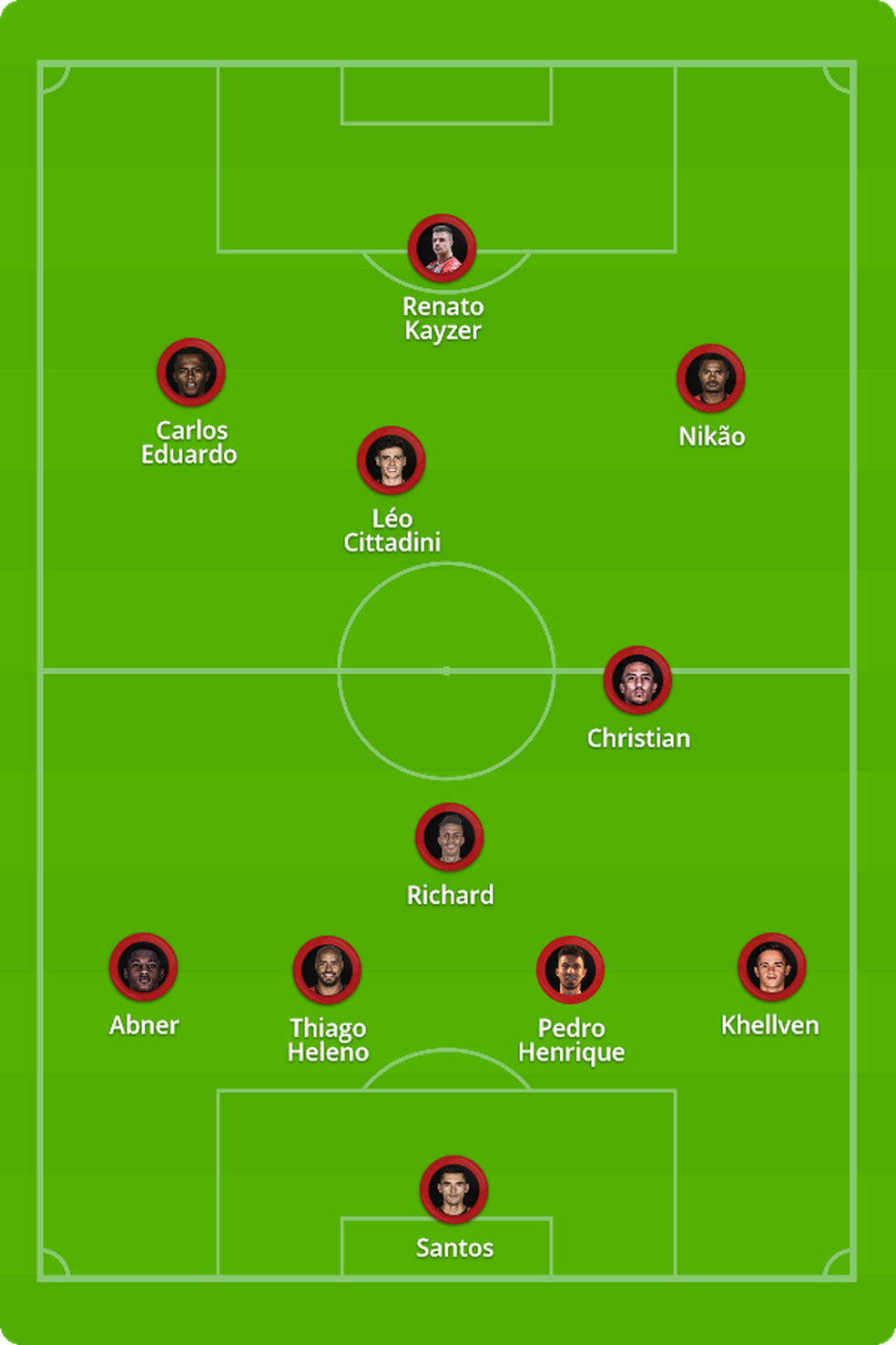 O Athletico: Santos; Khellven, Pedro Henrique, Thiago Heleno e Abner; Richard, Christian e Léo Cittadini; Nikão, Carlos Eduardo e Renato Kayzer.